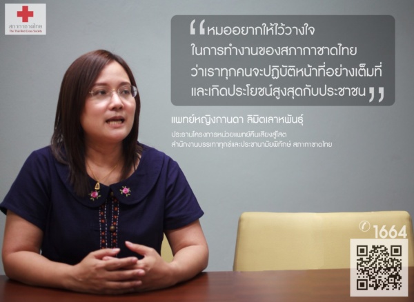 ทำงานด้วยใจ รักษาคนไข้เหมือนญาติของเรา “หมอเรียนจบด้านโสต ศอ นาสิกวิทยา คณะแพทยศาสตร์ จุฬาลงกรณ์มหาวิทยาลัย ตั้งแต่ปี 2547 เป็นหมอใช้ทุนที่โรงพยาบาลสมเด็จพระบรมราชเทวี ณ ศรีราชา และสถานีกาชาด ก่อนจะมาอยู่ที่สำนักงานบรรเทาทุกข์และประชานามัยพิทักษ์ในฐานะของการเป็นหมอ หู คอ จมูก ณ ตอนนั้นมีโครงการคืนเสียงสู่โสต โดย ผศ.ดร.นพ.ม.ล.กรเกียรติ์ สนิทวงศ์ เป็นผู้ริเริ่มโครงการนี้ขึ้นมา ร่วมกับ นพ.ศัลยเวทย์ เลขะกุล ซึ่งเป็นประธานมูลนิธิหู คอ จมูก ชนบทในขณะนั้น” “โครงการคืนเสียงสู่โสตเป็นโครงการหน่วยแพทย์เคลื่อนที่ ทำหน้าที่ให้บริการตรวจรักษาทั้งทางยาและการผ่าตัด รวมทั้งการตรวจวัดระดับการได้ยินแก่ผู้ป่วยที่มีปัญหาโรคทางหูในถิ่นทุรกันดารและมีฐานะยากจน โดยไม่คิดค่าใช้จ่าย เราจะเลือกพื้นที่ที่ไม่มีหมอหู คอ จมูก หรือมีหมอหู คอ จมูกที่ยังขาดความมั่นใจในการผ่าตัดหู ทำให้คนไข้คั่งค้างจำนวนมาก จากนั้นเราก็จะขนเครื่องมือไปออกหน่วย และทำการผ่าตัดให้คนไข้ที่หน่วย โดยคนไข้ไม่ต้องเดินทางอย่างยากลำบากเพื่อไปรับการรักษา” “ตามหลักการของการทำงาน ควรทำงานไปด้วยและมีความสุขไปด้วย แล้วความสุขจะหาได้จากที่ไหน อาจจะไม่ใช่ความสุขสบายส่วนตัว แต่ก็ต้องเป็นความสบายใจ ต้องหาอะไรสักอย่างที่ทำให้เรารู้สึกว่ามีความสุข ซึ่งอาชีพชุดขาวแบบนี้ การได้ทานข้าวเที่ยงบ้าง ไม่ได้ทานบ้างนั้นเป็นเรื่องปกติ ไม่ใช่เฉพาะหน่วยของสภากาชาดไทย แต่แพทย์และพยาบาลที่ปฏิบัติงานในทุกโรงพยาบาลต่างก็เจอชีวิตแบบนี้…