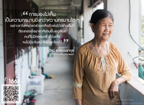 อยากกลับมาทำงานได้ ไม่ต้องเป็นภาระคนอื่น บางครั้งท้อมากจนถามตัวเองว่า ทุกวันนี้อยู่ไปทำไม หญิงชราอายุ 68 ปี ก่อนมองไม่เห็น มีอาชีพเป็นช่างตัดเสื้อราคาถูก เมื่อเวลาผ่านไปก็เริ่มมีอาการตาแดงก่ำและปวดตามาก จึงไปซื้อยาตามร้านขายยามาหยอดตาเอง แต่ไม่ได้เข้ารับการรักษาตามโรงพยาบาล เมื่อเข้ารับการรักษาจึงทำให้รู้ว่า ตาขวาบอดเนื่องจากม่านตาเสื่อมไปแล้ว ส่วนตาซ้ายเป็นโรคต้อกระจก ทำให้ชีวิตยังพอมีความหวังด้วยตาที่เหลือเพียงข้างเดียว เมื่อปี 2559 เกิดอาการไออย่างหนักและล้มอย่างแรง ทำให้เส้นประสาทฝอยในตาแตก จากนั้นได้ขึ้นทะเบียนเป็นผู้ป่วยรอเปลี่ยนกระจกตากับศูนย์ดวงตาฯ ซ้ำร้ายยังประสบอุบัติเหตุรถชนเมื่อปี 2560 ยิ่งส่งผลให้ตาซ้ายข้างที่เหลืออยู่แทบมองไม่เห็น ชีวิตเข้าสู่โลกมืดในที่สุด ปัจจุบันเป็นระยะเวลากว่า 2 ปี ที่รอคอยดวงตาบริจาคด้วยความหวังในทุกวัน ดำรงชีวิตด้วยความยากลำบาก มองไม่เห็นใคร ที่พอเห็นได้ก็เป็นแค่เงา ๆ การมองไม่เห็นเป็นความทรมานยิ่งกว่าความทรมานใด ๆ เพราะเราไม่สามารถช่วยเหลือตัวเองได้อย่างเต็มที่ ต้องคอยพึ่งพาอาศัยคนอื่นอยู่เสมอ คนที่ไม่มีครอบครัวก็ยิ่งแล้ว คงไม่รู้จะหันหน้าไม่พึ่งพาใครได้ หากท่านใดมีจิตเมตตา ขอเชิญชวนบริจาคดวงตาให้กับผู้ป่วยทั่วประเทศที่ยังรออีกเป็นจำนวนมาก หากได้รับการผ่าตัดเปลี่ยนกระจกตาและกลับมามองเห็นได้อีกครั้ง ก็อยากจะกลับมารับจ้างตัดเสื้อเหมือนเดิม จะได้มีรายได้เลี้ยงชีพตนเองได้ ส่วนคนที่รอกระจกตาเหมือนตนก็ขอให้อดทน เพราะชีวิตต้องมีความหวังต่อไป คุณรัสมี อารยะนรากูล ผู้ป่วยรอเปลี่ยนกระจกตา