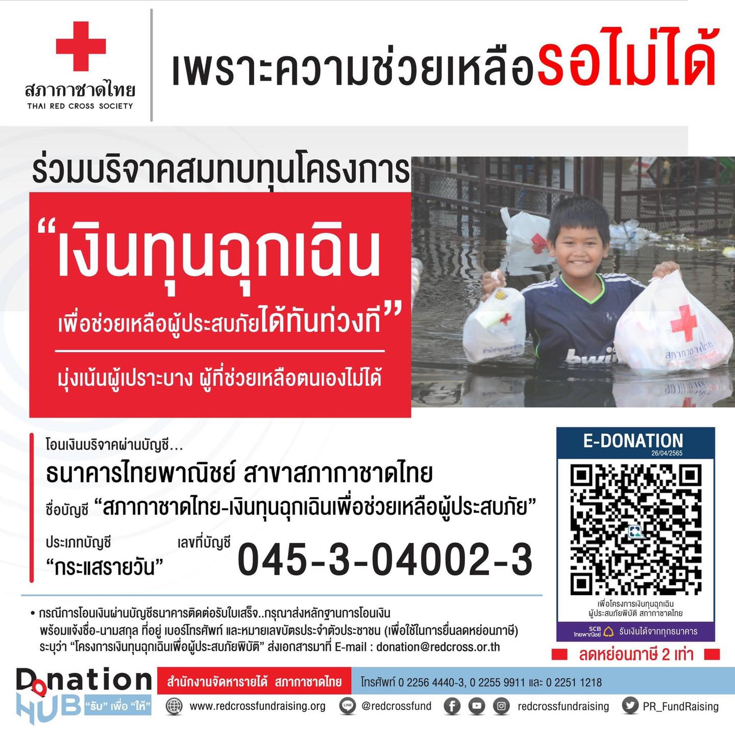 นอกจากนี้ สามารถร่วมสมทบทุนสนับสนุนการช่วยเหลือของสภากาชาดไทย ด้วยการบริจาคผ่านบัญชีธนาคารไทยพาณิชย์ สาขาสภากาชาดไทย ชื่อบัญชี “สภากาชาดไทย-เงินทุนฉุกเฉินเพื่อช่วยเหลือผู้ประสบภัย” ประเภทบัญชี : กระแสรายวัน เลขที่บัญชี 045-3-04002-3 หรือสแกน QR Code E-Donation ลดหย่อนภาษีได้ 2 เท่า