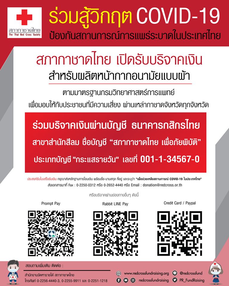 ทั้งนี้ สภากาชาดไทย จึงขอเชิญประชาชนร่วมเป็นส่วนหนึ่งในการป้องกันและลดความเสี่ยงการแพร่ระบาดของโรคติดเชื้อไวรัสโคโรนา 2019 (COVID-19) ด้วยการบริจาคเงินสมทบทุนการจัดทำหน้ากากอนามัยแบบผ้า โดยโอนเงินผ่านบัญชีธนาคารกสิกรไทย สาขาสำนักสีลม ชื่อบัญชี ” สภากาชาดไทย เพื่อภัยพิบัติ” ประเภทบัญชี “กระแสรายวัน” เลขที่ 001-1-34567-0 โดยขอรับใบเสร็จรับเงินเพื่อนำไปลดหย่อนภาษีได้ที่ [email protected] พร้อมแจ้งชื่อ-นามสกุล ที่อยู่ในการจัดส่งใบเสร็จ และเบอร์โทรศัพท์ แนบหลักฐานการโอนเงิน พร้อมระบุ “เพื่อช่วยเหลือสถานการณ์ COVID-19 ในประเทศไทย”