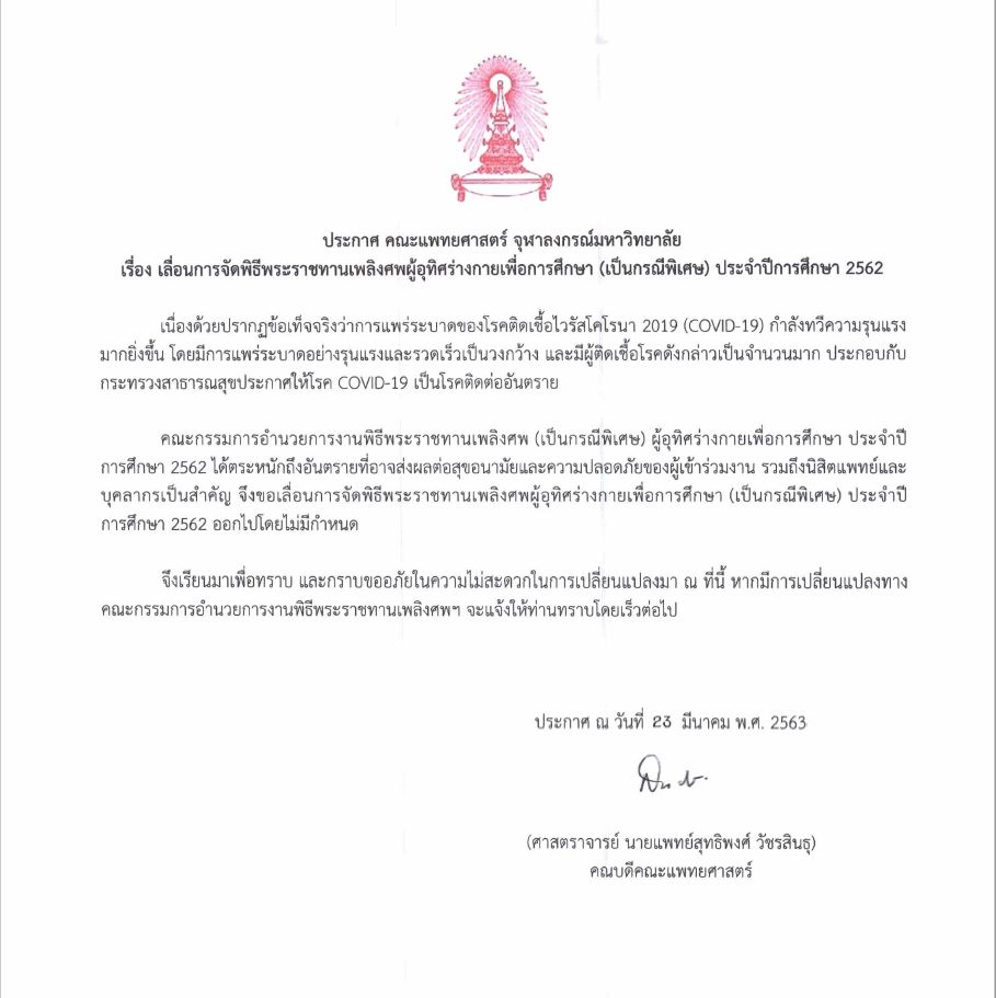 เนื่องจากการแพร่ระบาดของโรคติดเชื้อไวรัสโคโรนา 2019 (COVID-19) คณะแพทยศาสตร์ จุฬาลงกรณ์มหาวิทยาวิทยาลัย ประกาศเลื่อนการจัดพิธีพระราชทานเพลิงศพผู้อุทิศร่างกายเพื่อการศึกษา (เป็นกรณีพิเศษ) ประจำปีการศึกษา 2562 ออกไปโดยไม่มีกำหนด เพื่อความปลอดภัยของผู้เข้าร่วมงาน รวมทั้งนิสิตแพทย์และบุคลากร