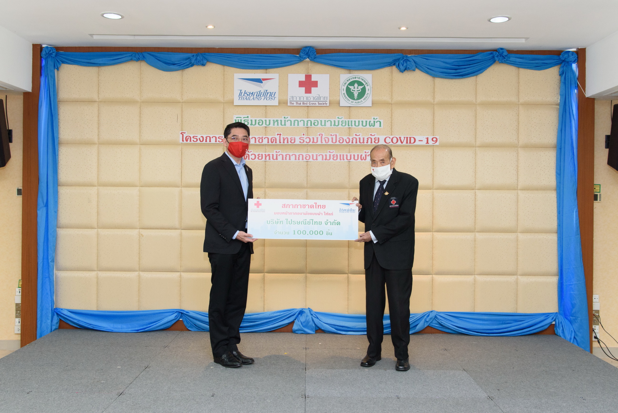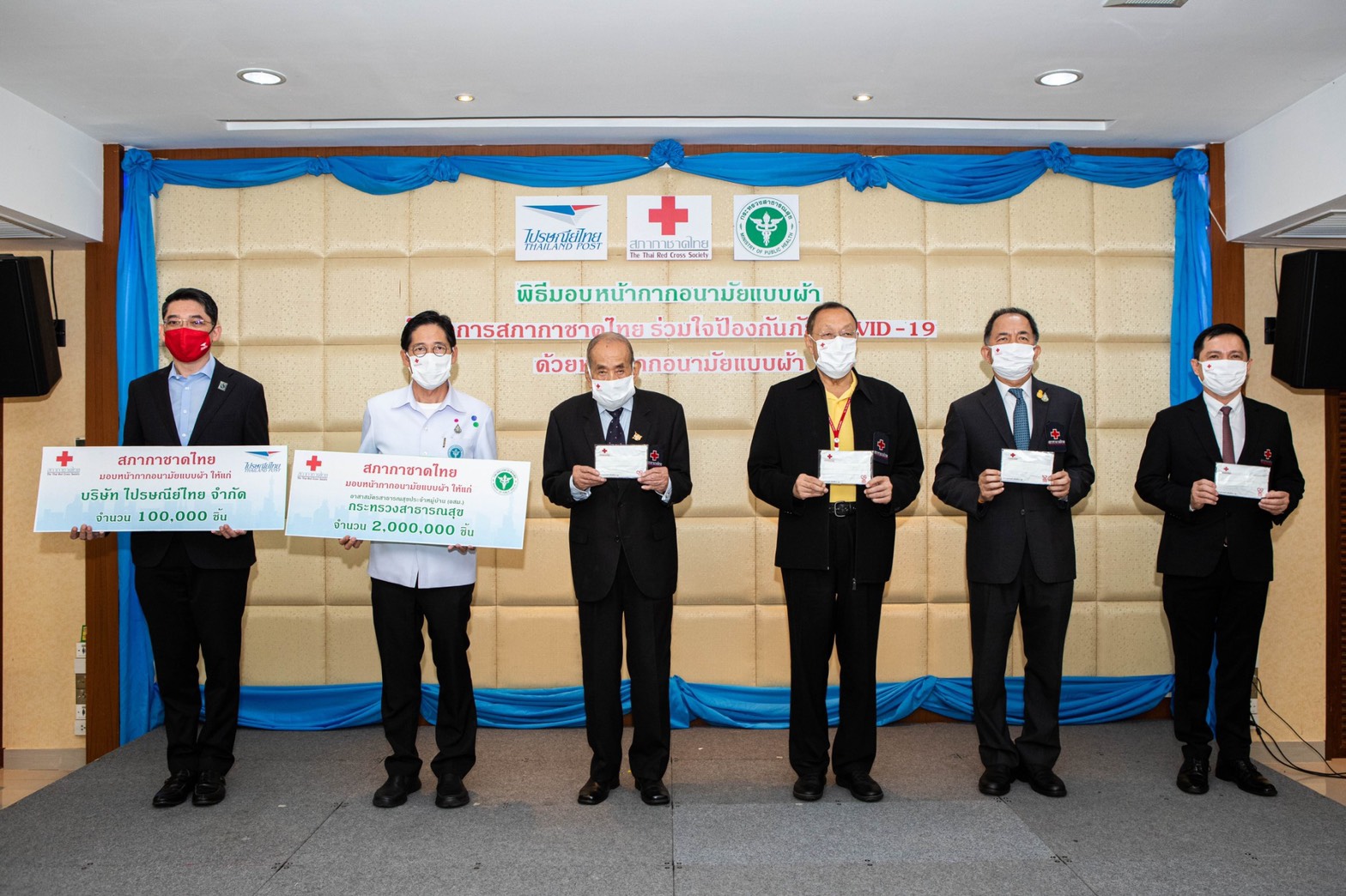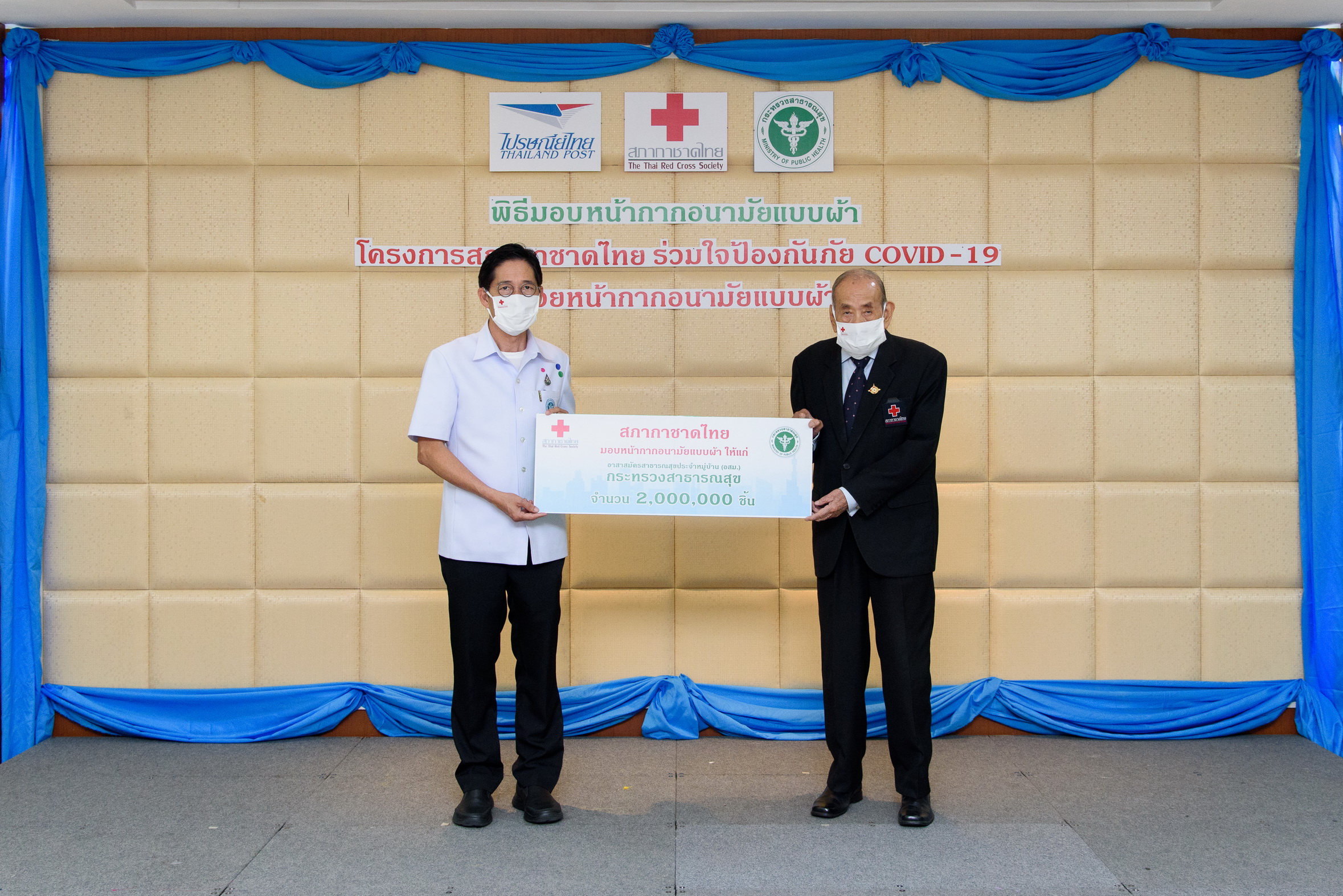 สภากาชาดไทย จัดพิธีมอบหน้ากากอนามัยแบบผ้าตามโครงการสภากาชาดไทยร่วมใจป้องกันภัย COVID-19 ด้วยหน้ากากอนามัยแบบผ้า โดยจะมอบให้กับกระทรวงสาธารณสุข และบริษัท ไปรษณีย์ไทย จำกัด เพื่อส่งมอบให้กับอาสาสมัครสาธารณสุขประจำหมู่บ้าน หรือ อสม. ซึ่งเป็นด่านหน้าในการเฝ้าระวังและควบคุมการระบาดของโรค และมอบให้กับประชาชนทั่วประเทศทั้ง 77 จังหวัด