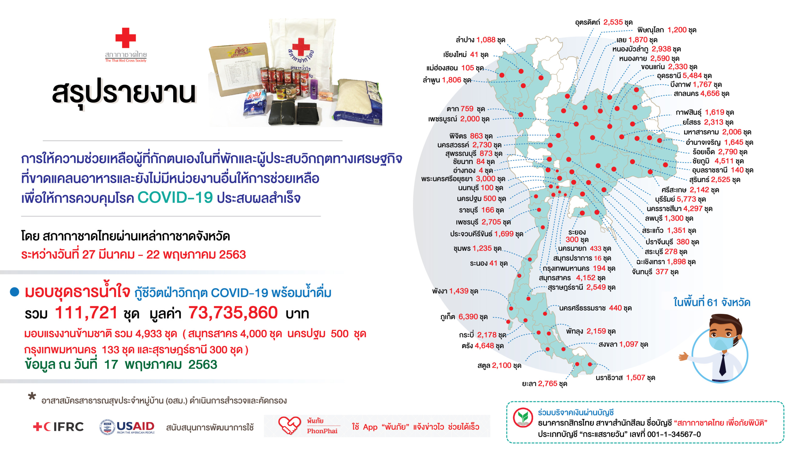 ตามที่ สมเด็จพระกนิษฐาธิราชเจ้า กรมสมเด็จพระเทพรัตนราชสุดาฯ สยามบรมราชกุมารี อุปนายิกาผู้อำนวยการสภากาชาดไทย พระราชทานพระราชานุญาตให้สภากาชาดไทย จัดตั้ง “ครัวพระราชทาน อุปนายิกาผู้อำนวยการสภากาชาดไทย” ณ สำนักงานเหล่ากาชาดจังหวัดสมุทรสาคร เป็นแห่งแรกของประเทศ ระหว่างวันที่ 8 – 17 พฤษภาคม 2563 เพื่อประกอบอาหารปรุงสุกใหม่สำหรับนำไปมอบให้แก่ประชาชนในพื้นที่จังหวัดสมุทรสาครที่ได้รับผลกระทบจากสถานการณ์การแพร่ระบาดของโรคโควิด-19 โดยตลอดระยะเวลา 10 วัน ได้ประกอบอาหารแจกจ่ายให้ประชาชนทั้งชาวไทยและแรงงานข้ามชาติในอำเภอเมือง อำเภอกระทุ่มแบน และอำเภอบ้านแพ้ว จำนวน 37 ตำบล รวมทั้งสิ้น 15,599 ชุด