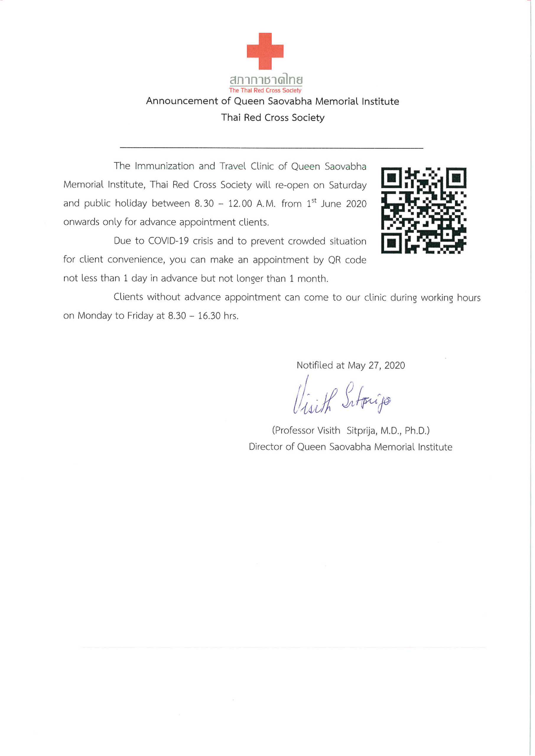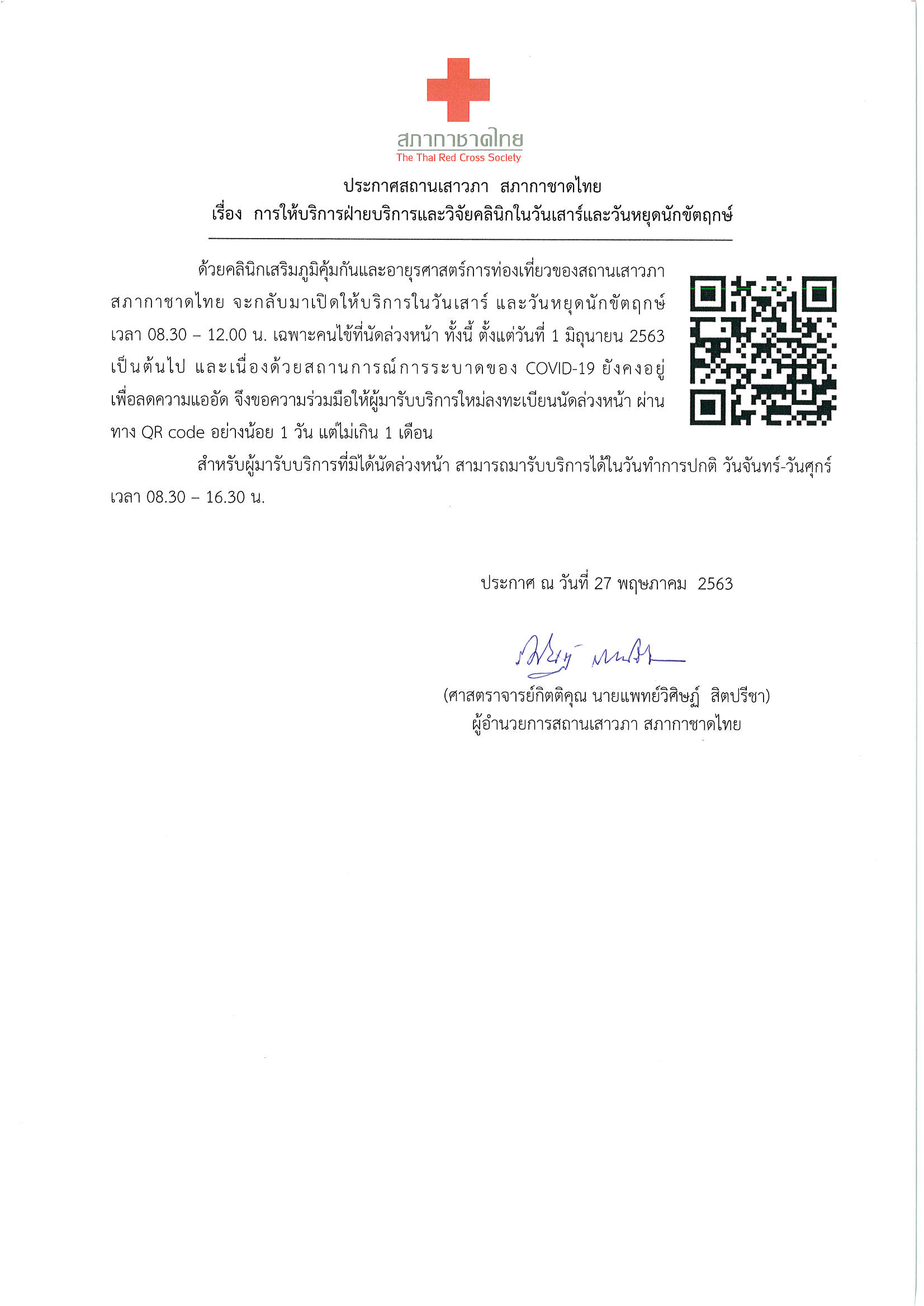 คลินิกเสริมภูมิคุ้มกันและอายุรศาสตร์การท่องเที่ยว สถานเสาวภา สภากาชาดไทย จะเปิดให้บริการในวันเสาร์ และวันหยุดนักขัตฤกษ์ เวลา 08.30 – 12.00 น. ตั้งแต่วันที่ 1 มิถุนายน 2563 เป็นต้นไป (วันอาทิตย์ปิดทำการ) โดยผู้ที่จะมารับบริการในวันและเวลาดังกล่าวจะต้องลงทะเบียนผ่านทาง QR Code อย่างน้อย 1 วัน แต่ไม่เกิน 1 เดือน