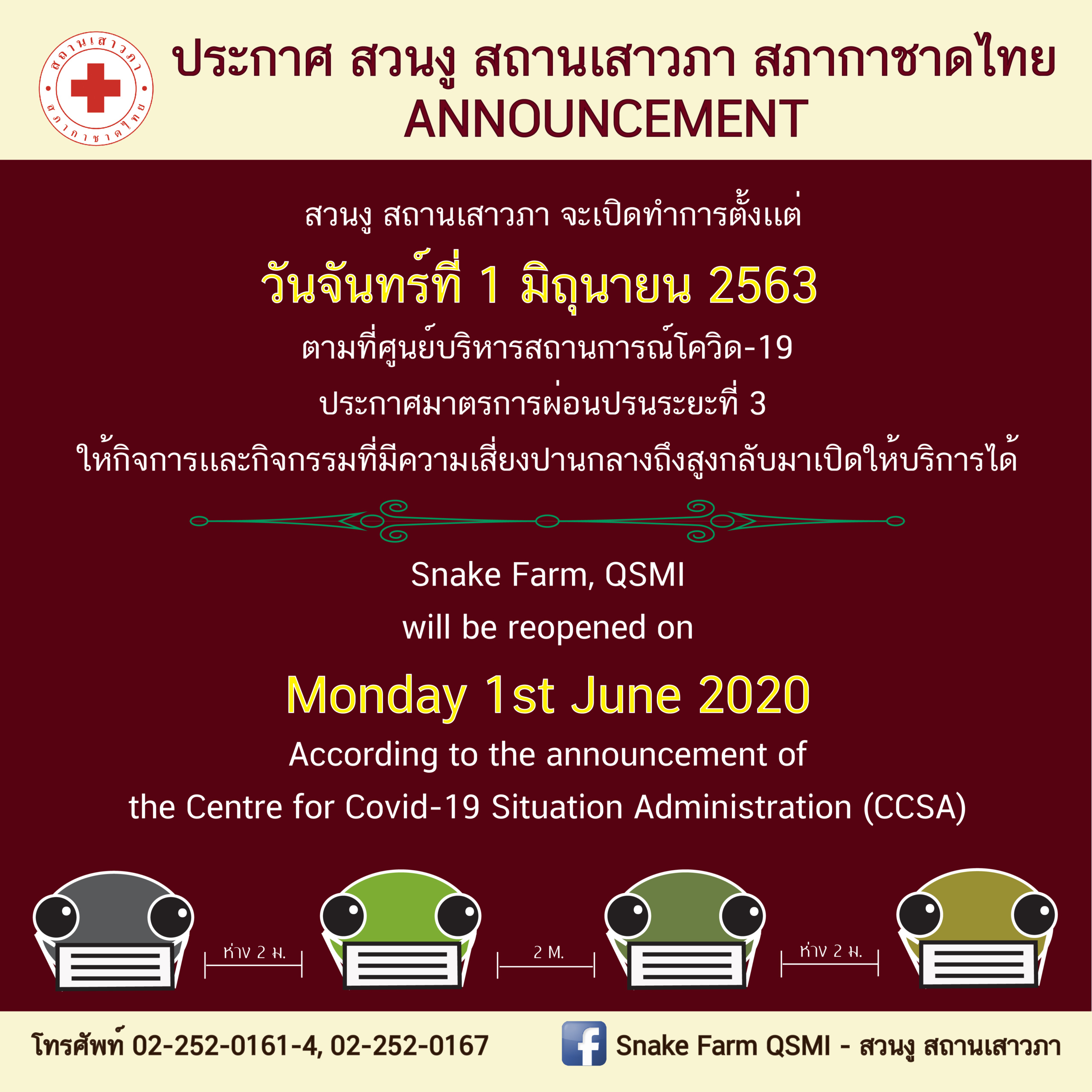 ตามที่ศูนย์บริหารสถานการณ์โควิด-19 ประกาศมาตรการผ่อนปรนระยะที่ 3 เมื่อวันศุกร์ที่ 29 พฤษภาคม 2563 ให้กิจการและกิจกรรมที่มีความเสี่ยงปานกลางถึงสูงกลับมาเปิดให้บริการได้ โดยเริ่มตั้งเเต่วันที่ 1 มิถุนายน 2563 นั้น สวนงู สถานเสาวภา สภากาชาดไทย จะเริ่มเปิดทำการในวันจันทร์ที่ 1 มิถุนายน 2563 เป็นต้นไป ตั้งเเต่เวลา 9.30 – 15.30น. และสวนงูจะเเสดงรีดพิษงู เวลา 11.00น. และเเสดงจับงู เวลา 14.30น. เเต่เนื่องจากสถานการณ์ยังไม่กลับมาเป็นปกติ สวนงูจะเปิดทำการเฉพาะวันจันทร์ – วันศุกร์ เท่านั้น และยังคงปิดทำการชั่วคราวในวันเสาร์ วันอาทิตย์ และวันหยุดนักขัตฤกษ์ ไปจนกว่าสถานการณ์การเเพร่ระบาดของเชื้อไวรัสโควิค-19 จะดีขึ้นจนกลับไปเป็นปกติ Categories: ข่าวประชาสัมพันธ์, ข่าวเด่น, สถานเสาวภา01/06/2020Tags: สถานเสาวภาสวนงู Share this post Share on FacebookShare on Facebook Share on XShare on X ข่าวที่เกี่ยวข้องสมเด็จพระกนิษฐาธิราชเจ้า กรมสมเด็จพระเทพรัตนราชสุดา ฯ สยามบรมราชกุมารี อุปนายิกาผู้อำนวยการสภากาชาดไทย ทรงบำเพ็ญพระราชกุศลถวายผ้าพระกฐินสภากาชาดไทย ประจำปี 2568 ณ วัดพระศรีรัตนมหาธาตุ สุพรรณบุรี จังหวัดสุพรรณบุรี15/10/2025การประชุมผู้นำกาชาดและเสี้ยววงเดือนแดงเอเชียตะวันออกเฉียงใต้ ครั้งที่ 22 29/09/2025สภากาชาดไทยส่งมอบน้ำใจจากผู้มีจิตศรัทธาไปยังกำลังพลที่เสียชีวิตและได้รับบาดเจ็บจากการปฏิบัติหน้าที่ในสถานการณ์ชายแดนไทย-กัมพูชา24/09/2025หัวหน้าคณะผู้แทนสหพันธ์สภากาชาดและสภาเสี้ยววงเดือนแดงระหว่างประเทศเข้าเยี่ยมคารวะเลขาธิการสภากาชาดไทย10/09/2025สภากาชาดไทย จับมือ จุฬาลงกรณ์มหาวิทยาลัย ลงนามบันทึกข้อตกลงความร่วมมือทางการวิจัยและพัฒนา เพื่อเสริมสร้างศักยภาพของประเทศด้านการพัฒนาวัคซีนและยาชีววัตถุ05/09/2025สภากาชาดไทย ร่วมมือกับ กระทรวงสาธารณสุข และสำนักงานพัฒนาวิทยาศาสตร์และเทคโนโลยีแห่งชาติ ลงนามบันทึกข้อตกลงความร่วมมือในการประยุกต์ใช้เทคโนโลยีระบุตัวตนของบุคคลที่ไม่มีเอกสารประจำตัวในประเทศไทย เพื่อการสาธารณสุขและช่วยเหลือด้านมนุษยธรรม05/09/2025