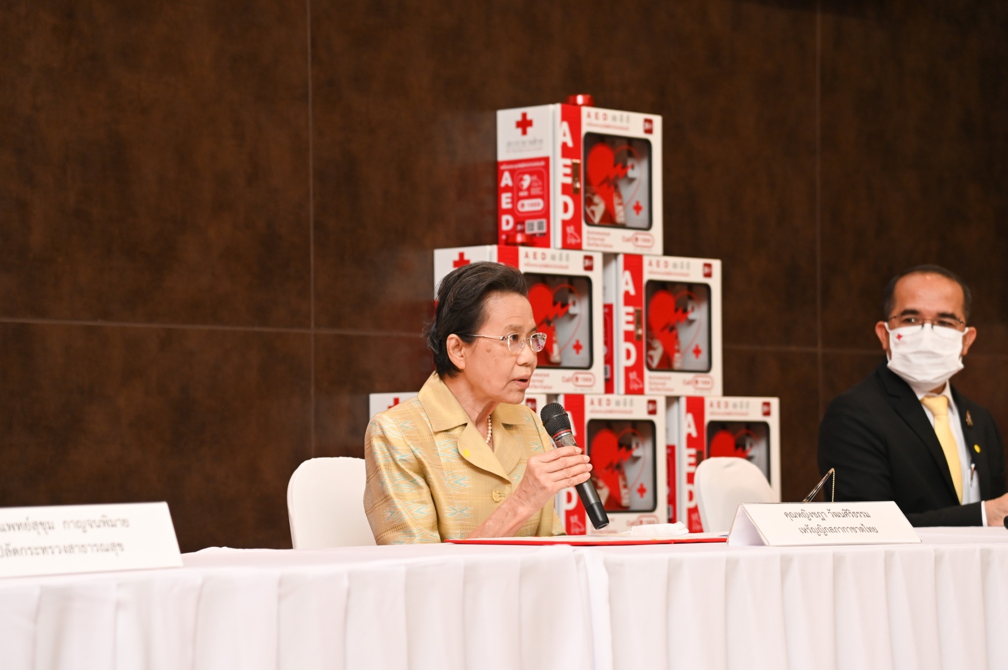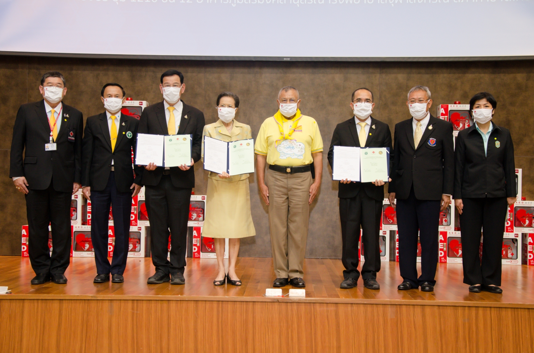 วันจันทร์ที่ 14 กันยายน 2563 เวลา 14.00 น. สภากาชาดไทยจัดพิธีลงนามบันทึกข้อตกลงความร่วมมือโครงการบริจาคเครื่องกระตุกหัวใจไฟฟ้าอัตโนมัติ (AED) ร่วมกับ กระทรวงสาธารณสุข และกระทรวงมหาดไทย ณ ห้องประชุม 1210 ชั้น 12 อาคารภูมิสิริมังคลานุสรณ์ โรงพยาบาลจุฬาลงกรณ์ สภากาชาดไทย โดยมี พลอากาศเอกนายแพทย์สุบิน ชิวปรีชา กรมวังผู้ใหญ่ในพระองค์ 904 และที่ปรึกษาศูนย์อำนวยการใหญ่จิตอาสาพระราชทาน นายแพทย์สุขุม กาญจนพิมาย ปลัดกระทรวงสาธารณสุข นายสมคิด จันทมฤก รองปลัดกระทรวงมหาดไทย พลตำรวจตรี นายแพทย์โสภณ กฤษณะรังสรรค์ ประธานมูลนิธิสอนช่วยชีวิต และคุณหญิงชฎา วัฒนศิริธรรม เหรัญญิกสภากาชาดไทยและประธานคณะกรรมการอำนวยการโครงการบริจาคเครื่องกระตุกหัวใจไฟฟ้าอัตโนมัติ (AED) ร่วมในพิธีลงนาม