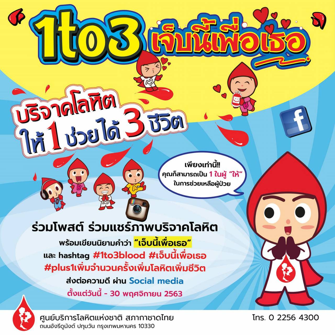 ศูนย์บริการโลหิตแห่งชาติ สภากาชาดไทย เชิญชวนร่วมส่งต่อความดีบนโลกสังคมออนไลน์กับโครงการ “1to3blood เจ็บนี้เพื่อเธอ” สร้างกระแสการบริจาคโลหิตบน Social Media ผ่าน Facebook หรือ Instagram เพียงโพสต์ภาพและข้อความพร้อมติด hashtag #1to3blood #เจ็บนี้เพื่อเธอ #plus1เพิ่มจำนวนครั้งเพิ่มโลหิตเพิ่มชีวิต พร้อมตั้งค่าข้อความเป็น Public (สาธารณะ) เพียงเท่านี้คุณก็สามารถเป็น 1 ในผู้ “ให้” ในการช่วยเหลือผู้ป่วย ตั้งแต่วันนี้-30 พฤศจิกายน 2563