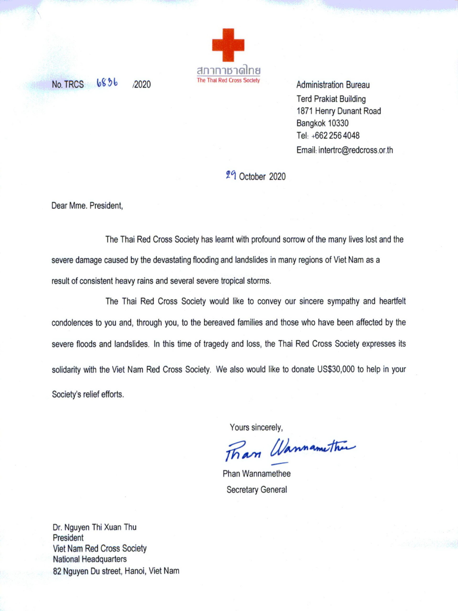 เมื่อวันที่ 6 พฤศจิกายน 2563 สภากาชาดไทยได้สนับสนุนเงินช่วยเหลือฉุกเฉินเป็นจำนวน 30,000 เหรียญสหรัฐ หรือ 926,600 บาท และส่งหนังสือแสดงความเสียใจต่อสภากาชาดเวียดนามต่อเหตุอุทกภัยและดินถล่มในภาคกลางของสาธารณรัฐสังคมนิยมเวียดนาม อันเป็นผลมาจากฝนตกหนักและพายุหลายลูก ตั้งแต่กลางเดือนตุลาคม 2563 เป็นต้นมา เหตุภัยพิบัติดังกล่าวทำให้มีผู้เสียชีวิตไปแล้ว 157 คน และมีผู้สูญหาย 68 คน น้ำท่วมบ้านเรือนมากกว่า 360,000 หลังและโรงเรียน 106 แห่ง พืชผลเสียหายในพื้นที่มากกว่า 12,000 เฮคตาร์ ปศุสัตว์และเป็ดไก่ตายไปกว่า 767,000 ตัว ใน 9 จังหวัด ถนนสายหลักได้รับความเสียหายจำนวน 16 สาย และถนนสายรองคิดเป็นความยาวกว่า 161 กิโลเมตร ใน 4 จังหวัด และทำให้ประชาชนมากกว่า 100,000 คน ต้องการที่พักพิงชั่วคราว และขาดแคลนน้ำดื่ม อาหาร และรายได้