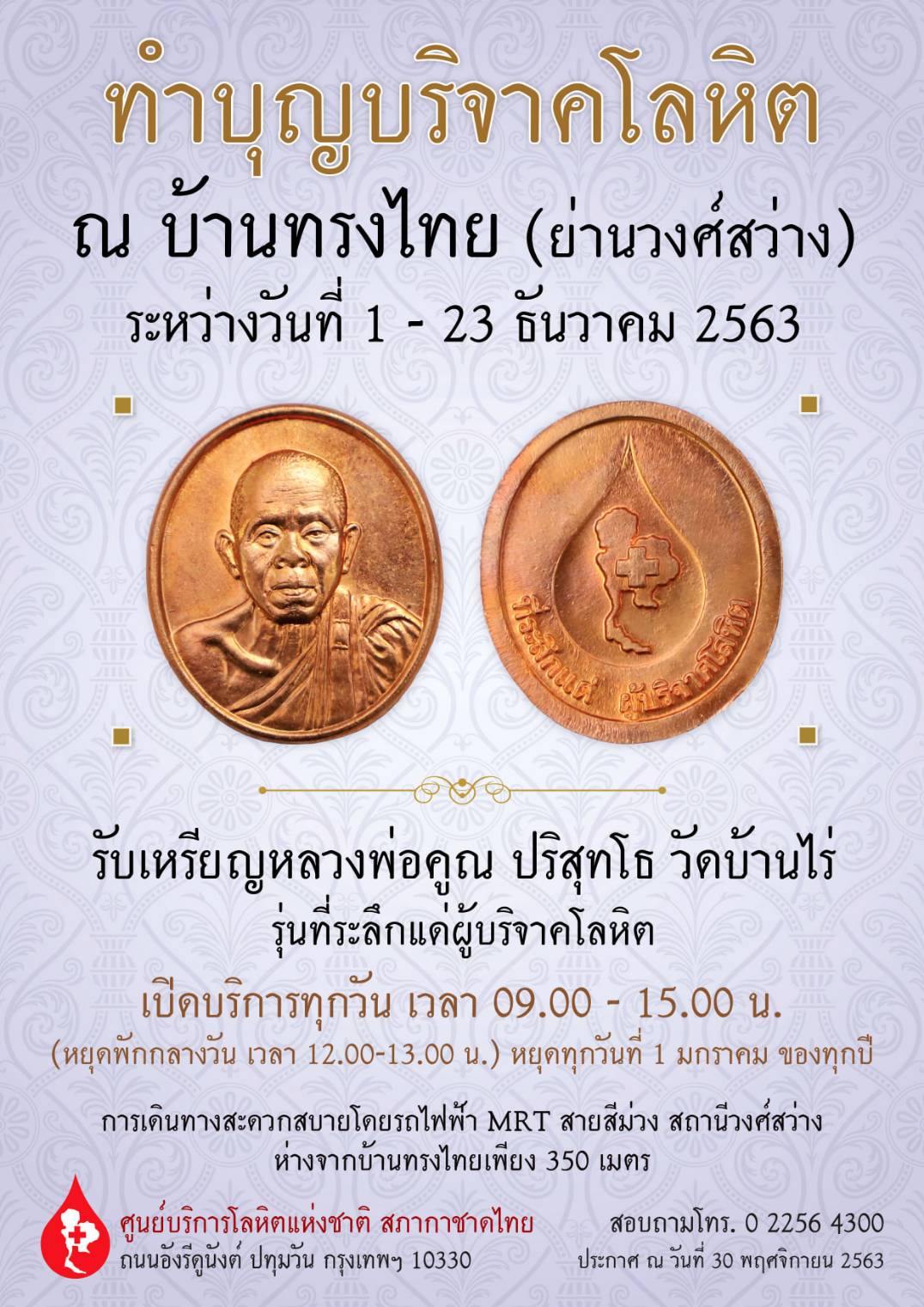 ดังนั้น เพื่อจัดหาโลหิตให้ได้ตามเป้าหมาย และประชาชนได้มีส่วนร่วมในการบริจาคโลหิตช่วยเหลือผู้ป่วย ด้วยการเป็น “ผู้ให้” ด้วยความสมัครใจ โดยไม่หวังสิ่งตอบแทน จึงได้จัดกิจกรรมเชิญชวนผู้ที่มี สุขภาพดี ร่วมทำบุญบริจาคโลหิต พร้อมสัมผัสบรรยากาศแบบคลาสสิค ณ หน่วยรับบริจาคโลหิตประจำที่ บ้านทรงไทย (ย่านวงศ์สว่าง) ระหว่างวันที่ 1 – 23 ธันวาคม 2563 ผู้บริจาคโลหิตจะได้รับ“เหรียญหลวงพ่อคูณปริสุทโธ วัดบ้านไร่ รุ่นที่ระลึกแด่ผู้บริจาคโลหิต” โดยเหรียญดังกล่าวผลิตในปี 2539 มีลักษณะเป็นรูปไข่ เนื้อทองแดง ด้านหน้าเหรียญเป็นรูปหลวงพ่อคูณ ปริสุทโธ ด้านหลังจารึกข้อความ “ที่ระลึกแด่ผู้บริจาคโลหิต”
