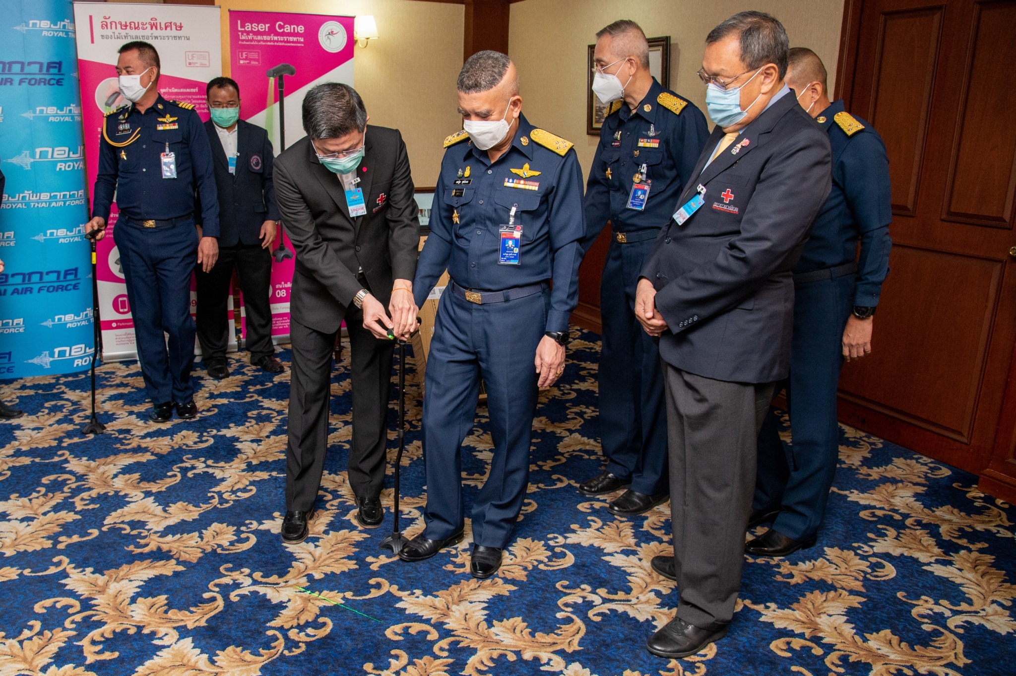 ศูนย์ความเป็นเลิศทางการแพทย์โรคพาร์กินสันฯ ได้พัฒนาไม้เท้าเลเซอร์พระราชทานให้ มีน้ำหนักเบา ตั้งได้ มีความโค้งงอในส่วนปลายเพื่อรับกับสรีระของผู้ป่วยช่วยลดการสะดุดหรือหกล้ม รวมถึงชาร์จไฟได้ ซึ่งได้รับการสนับสนุนจาก สำนักงานจัดหารายได้ สภากาชาดไทย กรมกิจกรรมผู้สูงอายุ กระทรวงการพัฒนาสังคมและความมั่นคงของมนุษย์ และโรงพยาบาลจุฬาลงกรณ์ สภากาชาดไทย ได้ส่งมอบไม้เท้าเลเซอร์พระราชทานให้แก่ผู้ป่วยและผู้สูงอายุที่มีอาการเดินติด ก้าวขาไม่ออกทั่วประเทศ ตั้งแต่เดือนมิถุนายน 2563 จำนวนมากกว่า 3,5000 ชิ้น โดยในครั้งนี้กองทัพอากาศจะเป็นตัวแทนในการส่งมอบไม้เท้าเลเซอร์พระราชทาน ให้กับผู้ที่มีอาการเดินติด ก้าวขาไม่ออกทั่วประเทศ จำนวน 500 ชิ้น เพื่อให้ผู้ป่วยและผู้สูงอายุกลับมาก้าวเดินได้อย่างมั่นใจอีกครั้ง