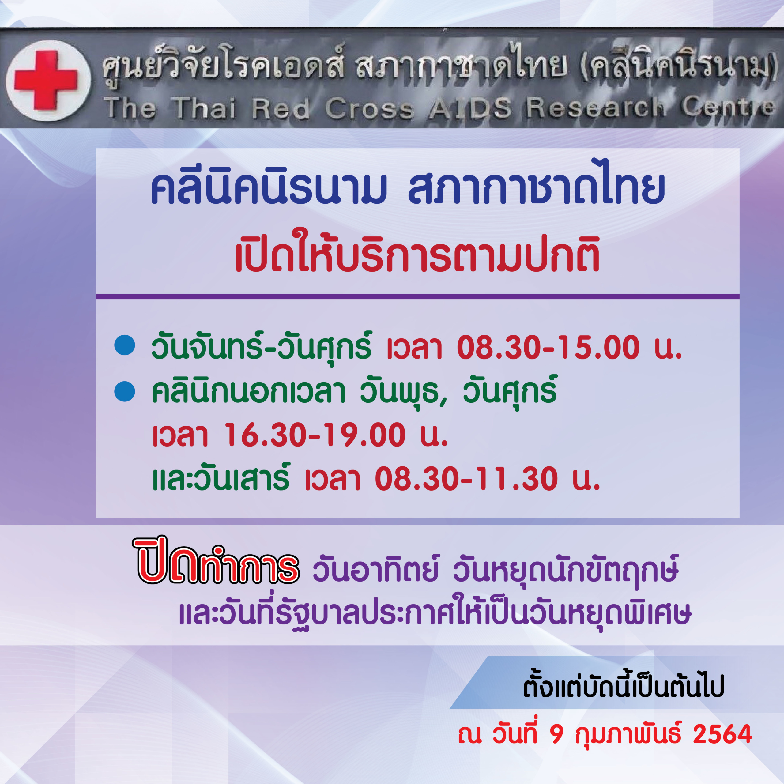 คลีนิคนิรนาม ศูนย์วิจัยโรคเอดส์ สภากาชาดไทย เปิดทำการตามปกติ ตั้งแต่วันที่ 9 กุมภาพันธ์ 2564 เป็นต้นไป ดังนี้