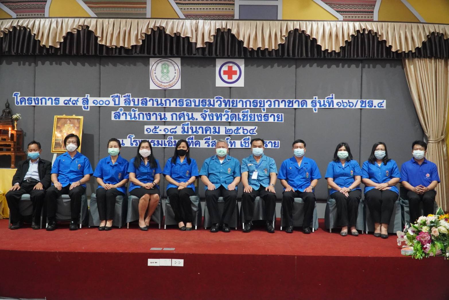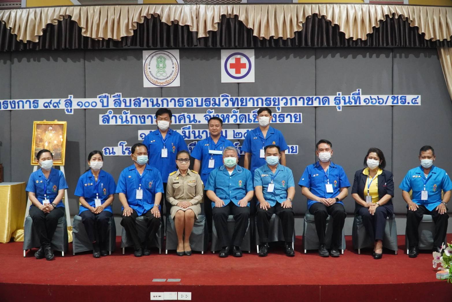 วันที่ 15 มีนาคม 2564 นายวุฒิชัย เสาวโกมุท รองผู้ว่าราชการจังหวัดเชียงราย เป็นประธานเปิดการอบรมวิทยากรยุวกาชาด รุ่นที่ 166/ชร.4 ตามโครงการ 99 สู่ 100 ปีสืบสานการอบรมวิทยากรยุวกาชาด สำนักงาน กศน.จังหวัดเชียงราย ณ โรงแรม เอ็ม บูทีค รีสอร์ทเชียงราย ถนนหน้าค่าย ตำบลรอบเวียง อำเภอเมืองเชียงราย โดยมี นายสุรพล วงศ์หวัน ผู้อำนวยการสำนักงาน กศน.จังหวัดเชียงราย พร้อมด้วยคณะกรรมการดำเนินงาน วิทยากร เจ้าหน้าที่ นำบุคลากรจากสถานศึกษาในสังกัดสำนักงาน กศน.จังหวัดเชียงราย ทั้ง 18 แห่ง กศน.อำเภอสวรรคโลก จังหวัดสุโขทัย และกศน.อำเภอไทรงาม จังหวัดกำแพงเพชร รวม 99 คน เข้าร่วมอบรมเชิงปฏิบัติการ