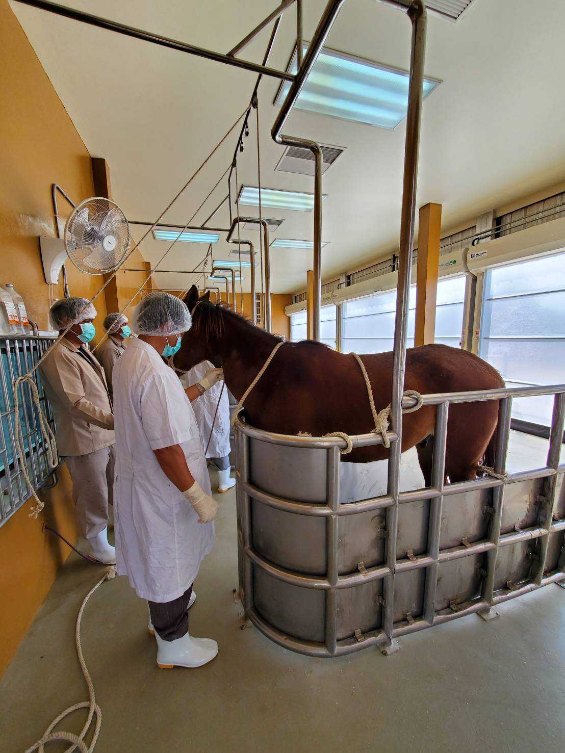 - การเจาะเก็บเลือดม้าที่ยืนอยู่ในซองม้า