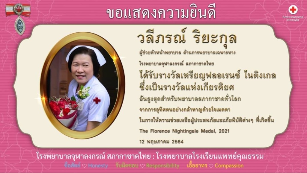 ขอแสดงความยินดีกับ นางวลีภรณ์ ริยะกุล ผู้ช่วยหัวหน้าพยาบาล ด้านการพยาบาลเฉพาะทางโรงพยาบาลจุฬาลงกรณ์ สภากาชาดไทย ในโอกาสได้รับเหรียญฟลอเรนซ์ ไนติงเกล ครั้งที่ 48 (48th Attribution of the Florence Nightingale) เนื่องในวันพยาบาลสากล ซึ่งเป็นรางวัลแห่งเกียรติยศอันสูงสุดสำหรับพยาบาลสภากาชาดทั่วโลก