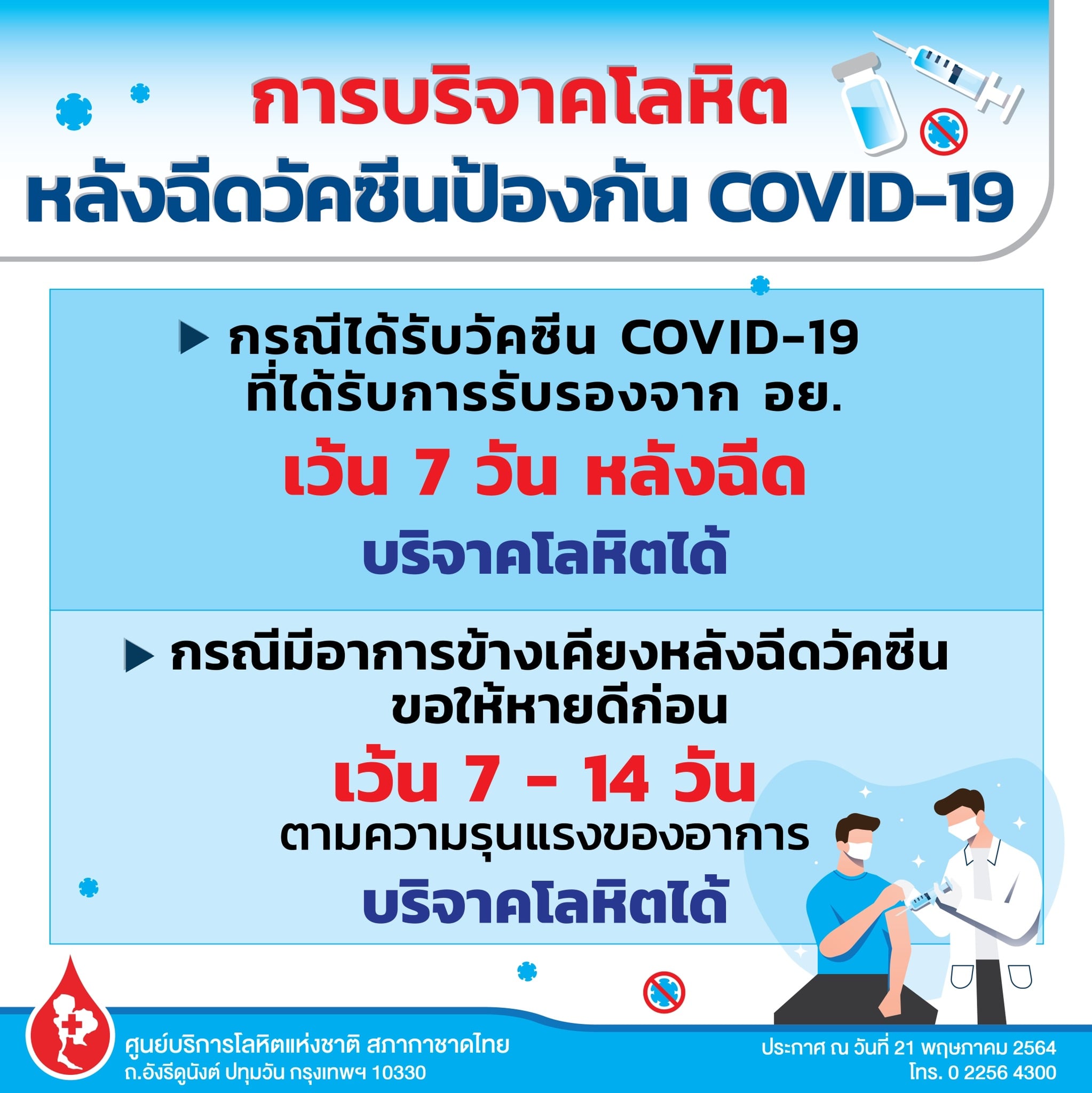 - กรณีได้รับวัคซีน COVID-19 ที่ได้รับการรับรองจากคณะกรรมการอาหารและยา (อย.) เว้น 7 วัน หลังฉีดวัคซีน