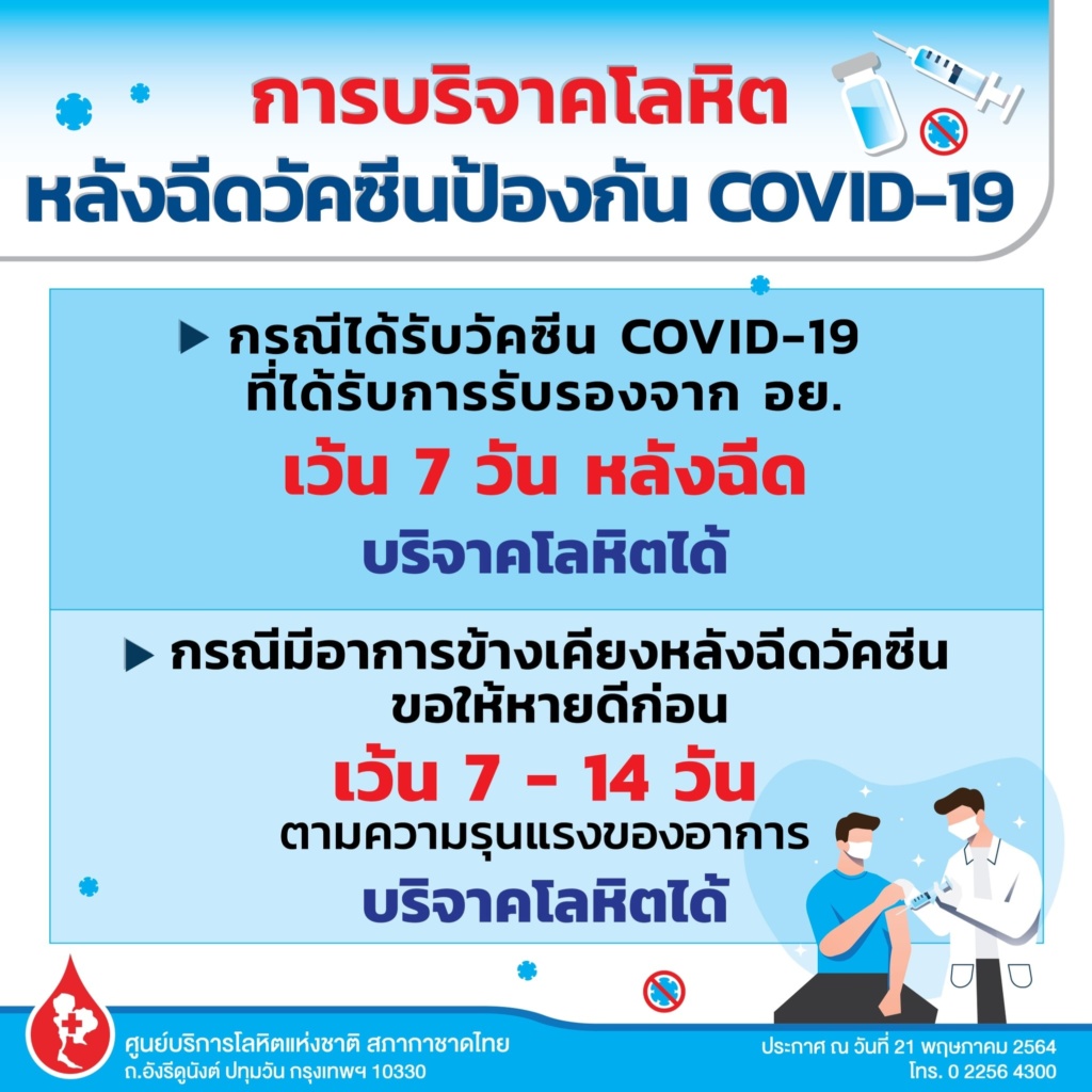 - สำหรับผู้ที่ได้รับการฉีดวัคซีนป้องกัน COVID-19 สามารถบริจาคโลหิตได้ ดังนี้