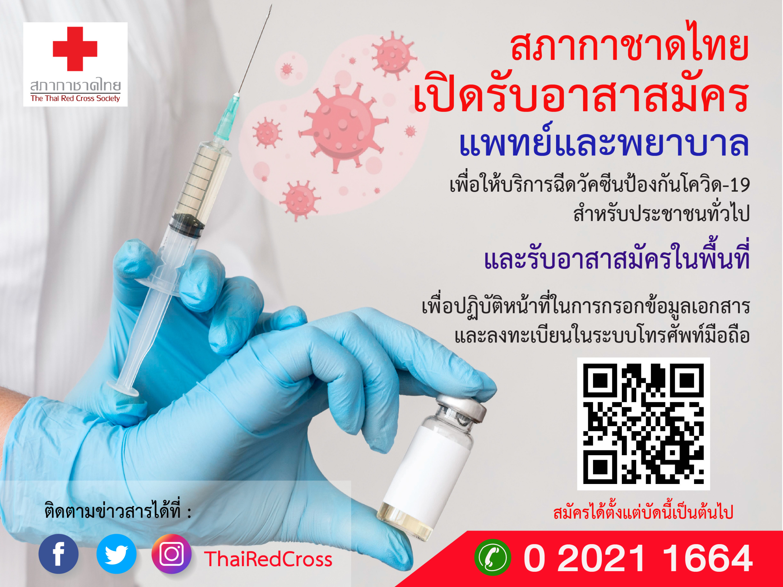 จากสถานการณ์การแพร่ระบาดของโรคโควิด-19 ในประเทศ ที่มีจำนวนผู้ติดเชื้อสูงขึ้นอย่างต่อเนื่อง จึงเป็นความจำเป็นยิ่งที่ต้องเร่งฉีดวัคซีนโควิด-19 ให้ประชาชนทั่วประเทศอย่างเร่งด่วน สภากาชาดไทยในฐานะองค์กรสาธารณกุศลระดับชาติและมีพันธกิจหลักที่สำคัญด้านการบริการทางการแพทย์และสุขภาพอนามัย ได้ระดมรับสมัครบุคลากรทางการแพทย์ที่มีจิตอาสา และอาสาสมัครทั่วไปมาให้บริการฉีดวัคซีนโควิด-19 แก่ประชาชนในพื้นที่ กรุงเทพมหานคร และส่วนภูมิภาค