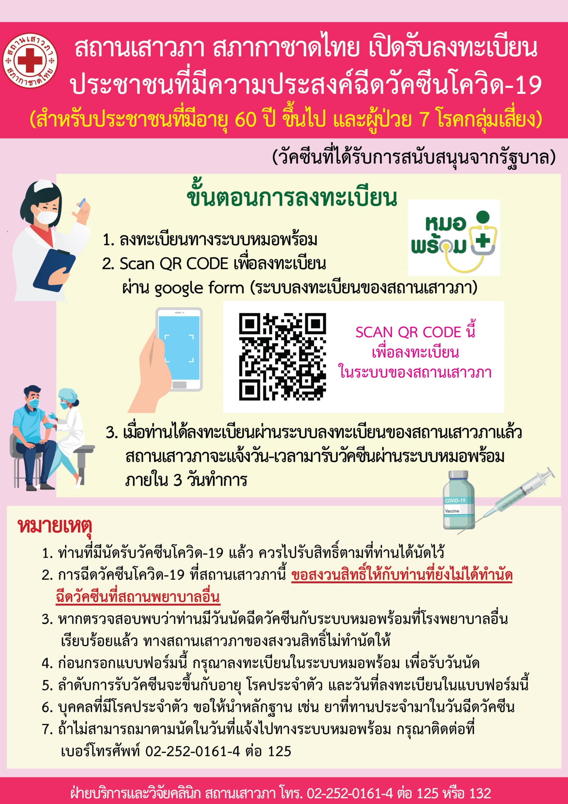 เปิดรับลงทะเบียนผ่าน google form ของสถานเสาวภา สำหรับประชาชนที่มีอายุ 60 ปี ขึ้นไป และผู้ป่วย 7 โรคกลุ่มเสี่ยง ได้แก่ 1.โรคทางเดินหายใจเรื้อรัง 2.โรคหัวใจและหลอดเลือด 3.โรคไตวายเรื้อรัง 4.โรคหลอดเลือดสมอง 5.โรคอ้วน 6.โรคมะเร็ง และ 7.โรคเบาหวาน