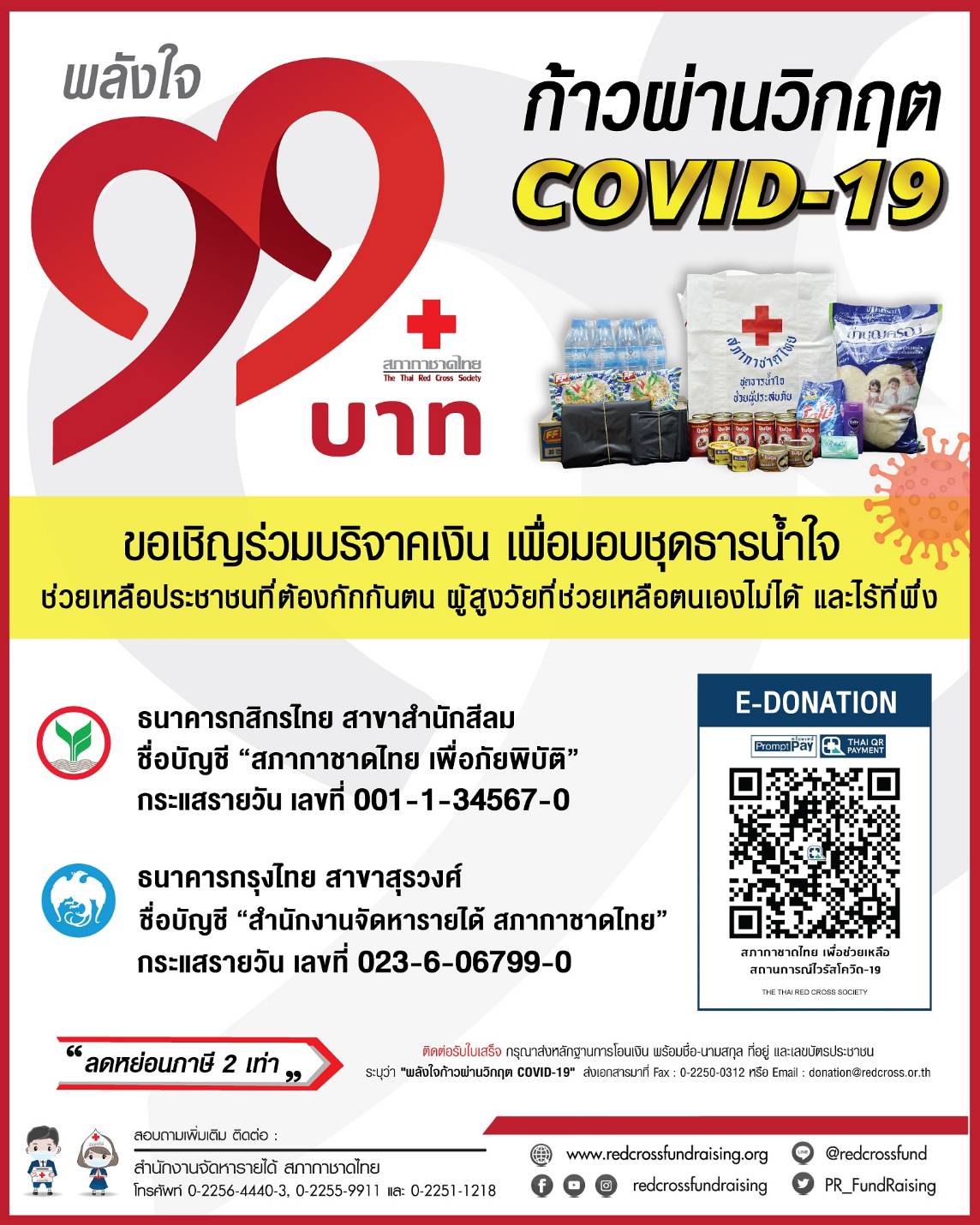 ผู้มีจิตศรัทธาสามารถร่วมบริจาคเงิน 99 บาท ในโครงการ “พลังใจ 99 บาท ก้าวผ่านวิกฤต COVID-19” เพื่อช่วยเหลือประชาชนที่ต้องกักกันตน ผู้สูงวัยที่ช่วยเหลือตนเองไม่ได้ และไร้ที่พึ่ง เพื่อลดความเสี่ยง ป้องกัน และเยียวยาในสถานการณ์การแพร่ระบาดของโควิด-19 ผ่านการดำเนินงานของสำนักงานบรรเทาทุกข์และประชานามัยพิทักษ์ สำนักงานบริหารกิจการเหล่ากาชาด สถานีกาชาด เหล่ากาชาดจังหวัด และกิ่งกาชาดอำเภอ ด้วยการสแกน QR CODE ผ่านแอปพลิเคชันธนาคารในระบบ E-DONATION หรือโอนเงินผ่านบัญชีธนาคารกสิกรไทย สาขาสำนักสีลม ชื่อบัญชี “สภากาชาดไทย เพื่อภัยพิบัติ” ประเภทบัญชี “กระแสรายวัน” เลขที่ 001-1-34567-0 หรือธนาคารกรุงไทย สาขาสุรวงศ์ ชื่อบัญชี “สำนักงานจัดหารายได้ สภากาชาดไทย” ประเภทบัญชี “กระแสรายวัน” เลขที่ 023-6-06799-0 สอบถามเพิ่มเติมโทร.1664