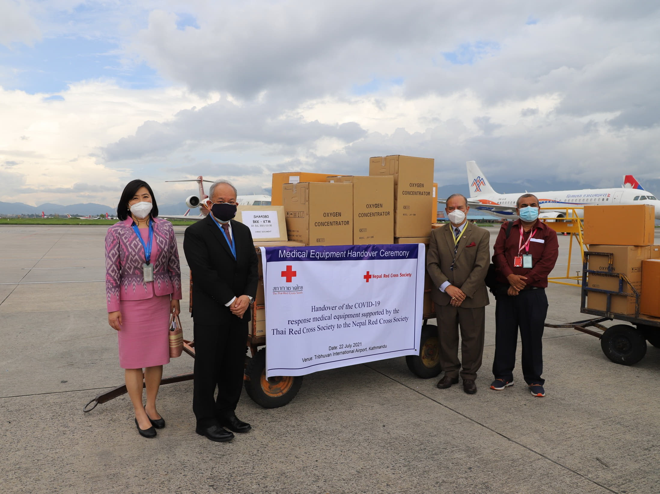 เมื่อวันที่ 22 กรกฎาคม 2564 ณ ท่าอากาศยานตรีภูวัน กรุงกาฐมาณฑุ นายโวสิต วรทรัพย์ เอกอัครราชทูต ณ กรุงกาฐมาณฑุ และนางสาวอุทุมพร อำไพวิทย์ อัครราชทูต เป็นผู้แทนสภากาชาดไทยในพิธีส่งมอบอุปกรณ์ทางการแพทย์ ได้แก่ เครื่องผลิตออกซิเจน (oxygen concentrator) เครื่องวัดออกซิเจนปลายนิ้ว ชุดป้องกันส่วนบุคคล และหน้ากาก N 95 เพื่อให้สภากาชาดเนปาลใช้ในการโต้ตอบการแพร่ระบาดใหญ่ของโรคโควิด–19 ในสหพันธ์สาธารณรัฐประชาธิปไตยเนปาล โดยมี ศาสตราจารย์ ดร. บิชวา เคชาร์ มาสเค รองประธานคณะกรรมการบริหารกลางสภากาชาดเนปาล และคณะเจ้าหน้าที่สภากาชาดเนปาล รับมอบ