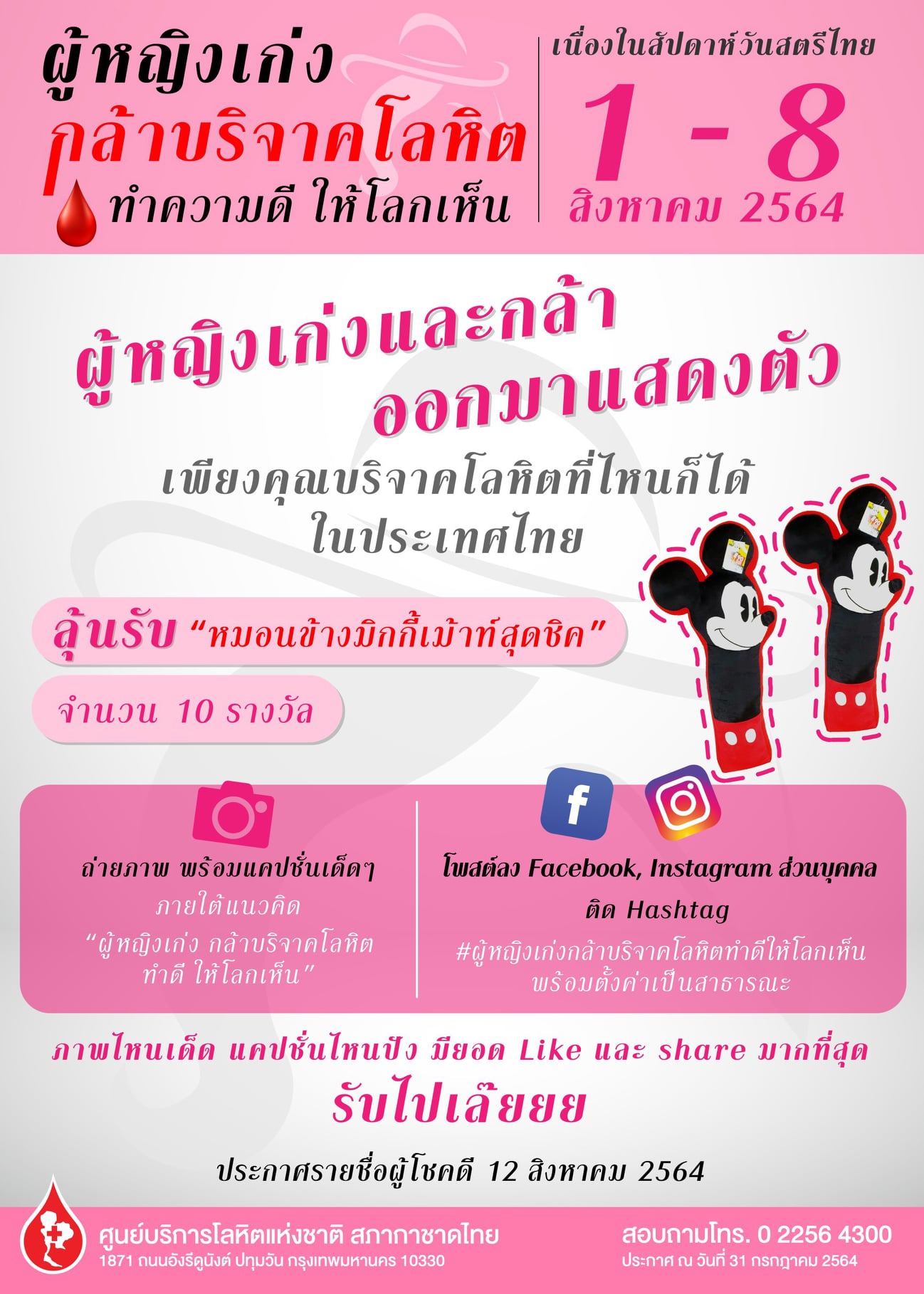 เนื่องในโอกาสวันเฉลิมพระชนมพรรษาสมเด็จพระนางเจ้าสิริกิติ์ พระบรมราชินีนาถ พระบรมราชชนนีพันปีหลวง ทรงเจริญพระชนมพรรษา 89 พรรษา 12 สิงหาคม 2564 ศูนย์บริการโลหิตแห่งชาติ สภากาชาดไทย จึงได้จัดทำโครงการ “ผู้หญิงเก่ง กล้าบริจาคโลหิต” เนื่องในวันสตรีไทย โดยจัดกิจกรรมเป็นสัปดาห์ ระหว่างวันที่ 1-8 สิงหาคม 2564 เพื่อเชิญชวนสตรีไทยทั่วประเทศที่มีสุขภาพดี ร่วมบริจาคโลหิตช่วยเหลือผู้ป่วย ลดปัญหาการขาดแคลนโลหิตในสถานการณ์การแพร่ระบาดของโรค COVID-19 พร้อมโพสต์ภาพและข้อความ ภายใต้แนวคิด “ผู้หญิงเก่งกล้าบริจาคโลหิต ทำดีให้โลกเห็น” ผ่านสื่อ Social Media : Facebook หรือ Instagram ส่วนบุคคล ติด #ผู้หญิงเก่งกล้าบริจาคโลหิตทำดีให้โลกเห็น ตั้งค่าเป็นสาธารณะ (Public) ภาพและข้อความที่มียอด Like และ Share สูงสุด ลุ้นรับ “หมอนข้างมิกกี้เม้าท์สุดชิค” จำนวน 10 รางวัล เป็นที่ระลึก และประกาศรายชื่อผู้โชคดี ในวันที่ 12 สิงหาคม 2564 สอบถามโทร. 0 2256 4300