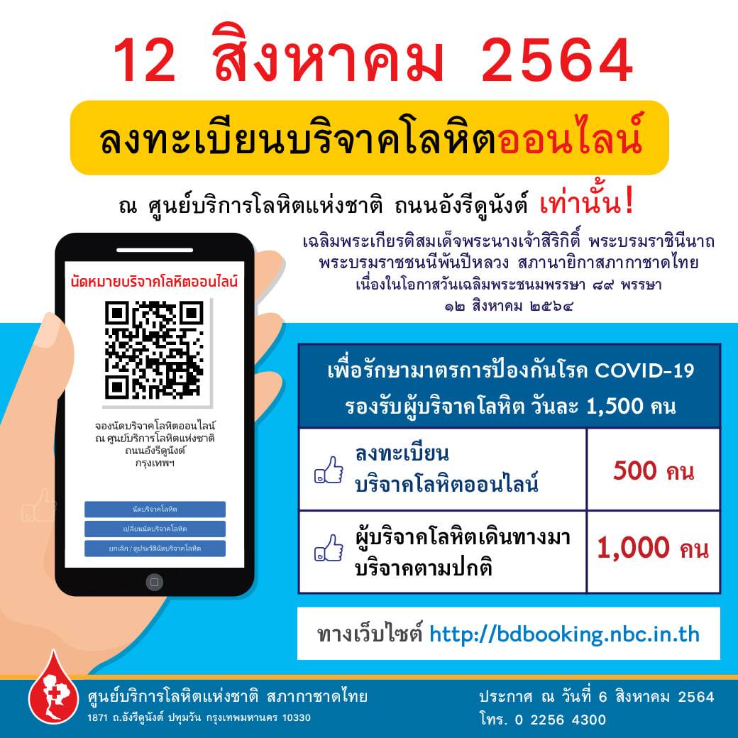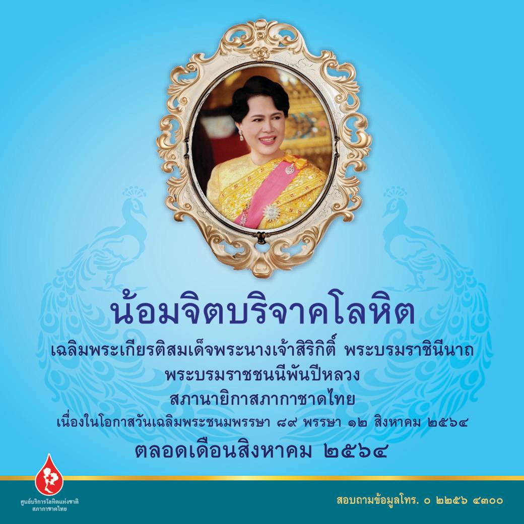 ศูนย์บริการโลหิตแห่งชาติ สภากาชาดไทย เชิญชวนพสกนิกรชาวไทยทั่วประเทศน้อมจิตบริจาคโลหิต เฉลิมพระเกียรติสมเด็จพระนางเจ้าสิริกิติ์ พระบรมราชินีนาถ พระบรมราชชนนีพันปีหลวง สภานายิกาสภากาชาดไทย เนื่องในโอกาสวันเฉลิมพระชนมพรรษา 89 พรรษา วันที่ 12 สิงหาคม 2564