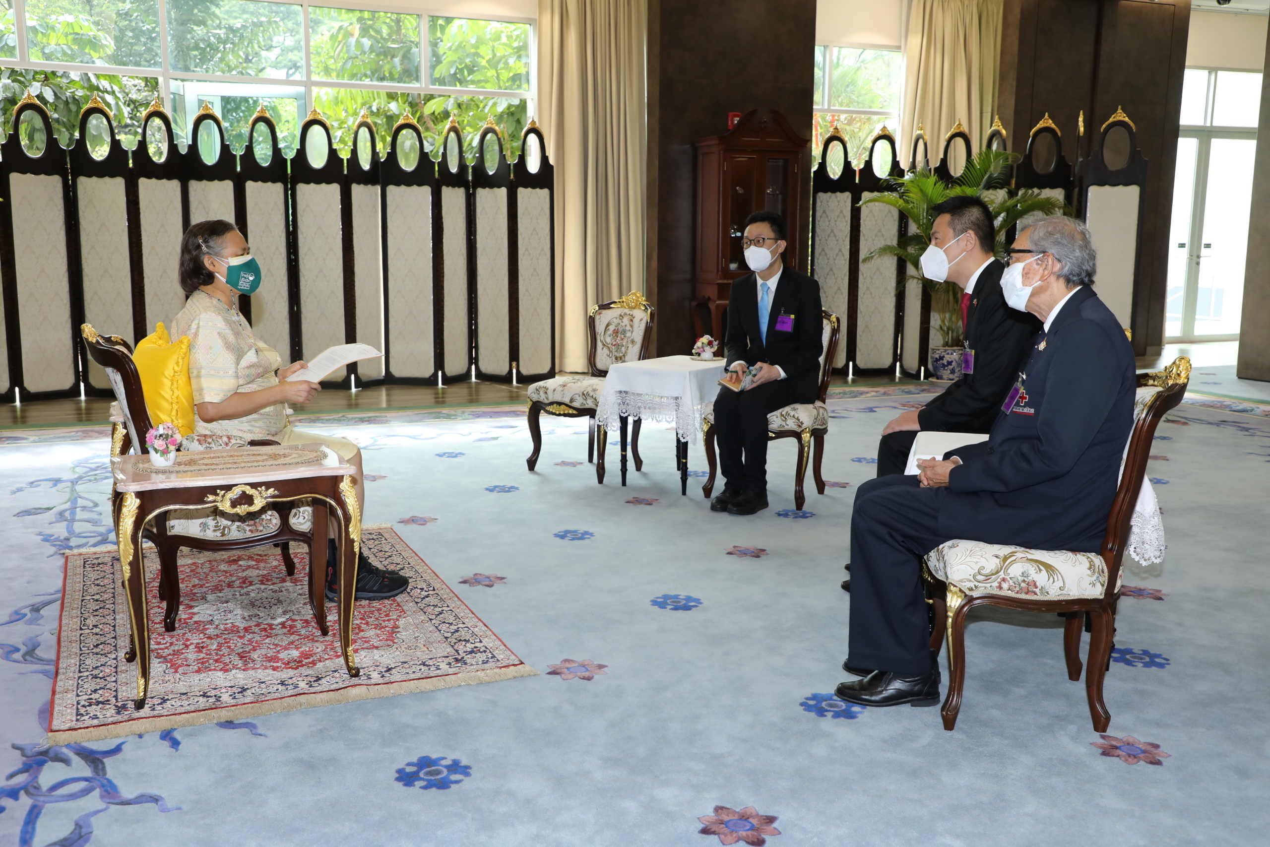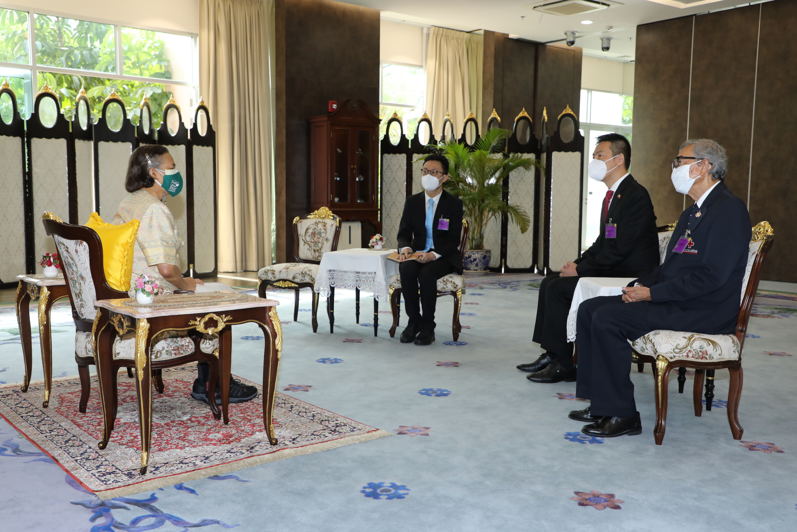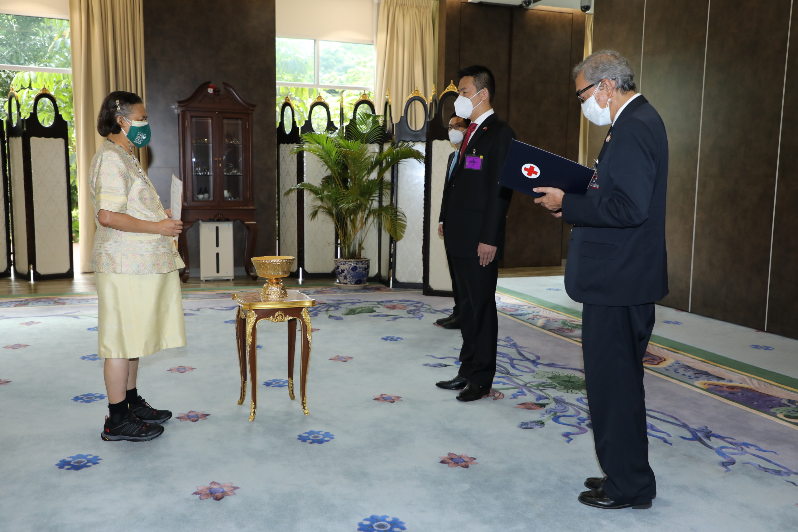 วันที่ 30 สิงหาคม 2564 สมเด็จพระกนิษฐาธิราชเจ้า กรมสมเด็จพระเทพรัตนราชสุดาฯ สยามบรมราชกุมารี อุปนายิกาผู้อำนวยการสภากาชาดไทย พระราชทานพระราชวโรกาสให้ นายเตช บุนนาค เลขาธิการสภากาชาดไทย นำนายหยาง ซิน อัครราชทูตที่ปรึกษา สถานเอกอัครราชทูตสาธารณรัฐประชาชนจีน ประจำประเทศไทย เป็นผู้แทนประธานสภากาชาดจีน เฝ้าทูลละอองพระบาทน้อมเกล้าน้อมกระหม่อม ถวายวัคซีนป้องกันโรคโควิด-19 ซิโนฟาร์ม จำนวน 100,000 โดส ณ วังสระปทุม เพื่อให้สภากาชาดไทยนำไปใช้ในการป้องกันการแพร่ระบาดใหญ่ของโรคโควิด -19 ต่อไป