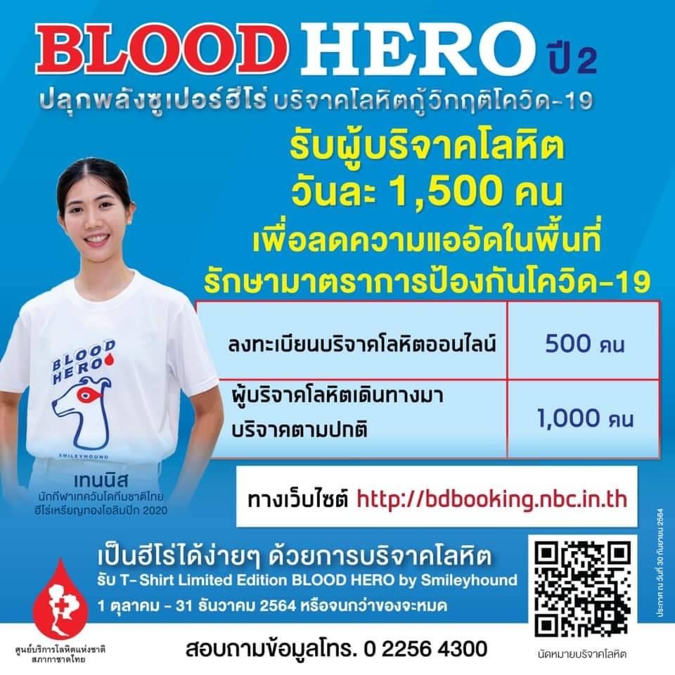 ศูนย์บริการโลหิตแห่งชาติ เชิญชวนซุปเปอร์ฮีโร่ที่มีสุขภาพแข็งแรง บริจาคโลหิต กู้วิกฤติ COVID-19 เพื่อสำรองโลหิตให้กับโรงพยาบาล ที่ต้องนัดผ่าตัดรักษาผู้ป่วยเพิ่มขึ้น รับเสื้อยืด “BLOOD HERO” ออกแบบโดย SMILEYHOUND BY GREYHOUND ดีไซน์เนอร์แบรนด์ชั้นนำของเมืองไทย ตลอดเดือนตุลาคม-ธันวาคม 2564 ณ.