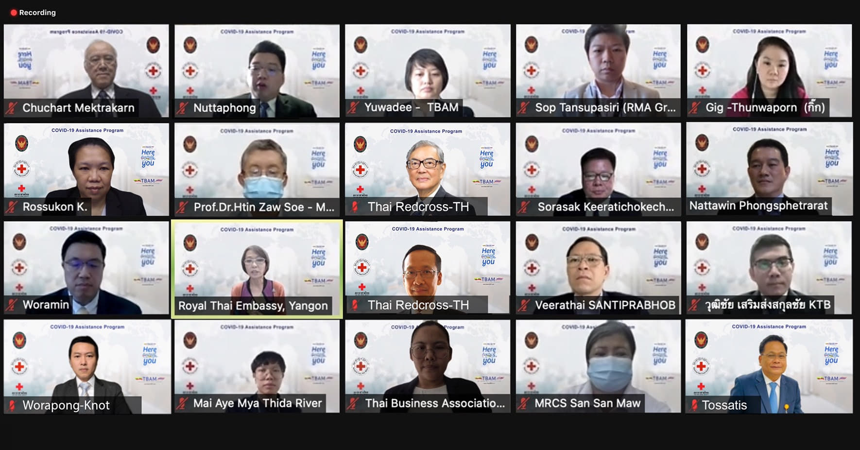 สภากาชาดไทย ร่วมกับ สมาคมธรุกิจไทย – เมียนมา และ สถานเอกอัครราชทูต ณ กรุงย่างกุ้ง ในโครงการ Here With You บริจาควัสดุอุปกรณ์ทางการแพทย์ และ ถังออกซิเจนขนาด 47 ลิตร จำนวน 300 ถัง พร้อมการหมุนเวียนเติมก๊าซออกซิเจนให้อีก จำนวน 9,000 ถัง สำหรับการดูแลผู้ป่วยจากโรคโควิด-19 เพื่อสนับสนุนปฏิบัติการตอบโต้สถานการณ์การแพร่ระบาดใหญ่ของโรคโควิด – 19 ในสาธารณรัฐแห่งสหภาพเมียนมา โดย นายเตช บุนนาค เลขาธิการสภากาชาดไทย และ ดร. อภิชาติ ชินวรรโณ ผู้ช่วยเลขาธิการสภากาชาดไทย ฝ่ายวิเทศสัมพันธ์ เป็นผู้แทนสภากาชาดไทย เข้าร่วมพิธีส่งมอบอย่างเป็นทางการให้สภากาชาดเมียนมา แบบออนไลน์ เมื่อวันที่ 27 กันยายน 2564