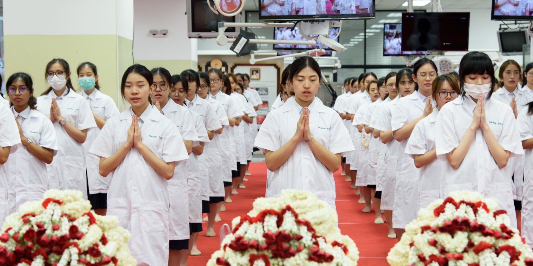 นิสิตพร้อมน้อมประนมก้มเศียรเกล้า กราบแทบเท้าท่านอาจารย์ผู้หลับใหล