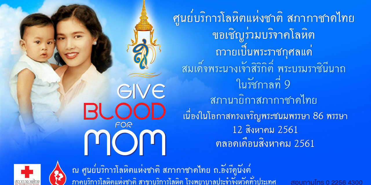 ศูนย์บริการโลหิตแห่งชาติ สภากาชาดไทย ขอเชิญพสกนิกรร่วมแสดงความจงรักภักดี บริจาคโลหิตถวายเป็นพระราชกุศลแด่ สมเด็จพระนางเจ้าสิริกิติ์ พระบรมราชินีนาถ ในรัชกาลที่ 9 สภานายิกาสภากาชาดไทย เนื่องในโอกาสทรงเจริญพระชนมพรรษา 86 พรรษา ในวันที่ 12 สิงหาคม 2561 ตั้งแต่เวลา 08.00-16.00 น.ร่วมบริจาคโลหิต ลงทะเบียนเป็นอาสาสมัครบริจาคสเต็มเซลล์ บริจาคอวัยวะ และดวงตา ณ ศูนย์บริการโลหิตแห่งชาติ ถนนอังรีดูนังต์