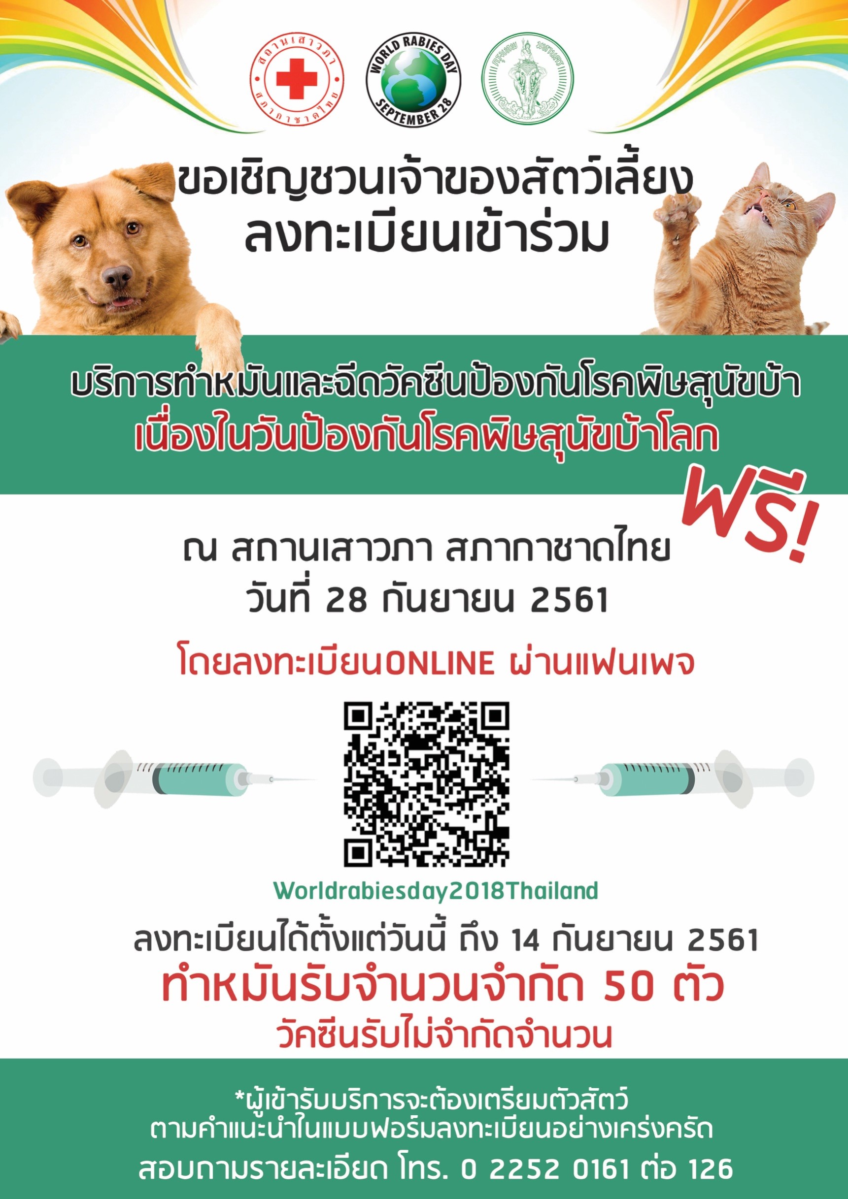 เพจ วันป้องกันโรคพิษสุนัขบ้าโลก 2561 ประกาศรับลงทะเบียนออนไลน์ ทำหมันและฉีดวัคซีนป้องกันโรคพิษสุนัขบ้าสำหรับสัตว์เลี้ยง ฟรี ! เนื่องในวันป้องกันโรคพิษสุนัขบ้าโลก ประจำปี 2561 ในวันที่ 28 กันยายน 2561 ณ สถานเสาวภา สภากาชาดไทย
