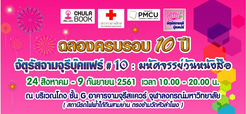 ในโอกาสก้าวสู่ปีที่ 10 ของการจัดงานจัตุรัสจามจุรีบุ๊คแฟร์ ศูนย์หนังสือจุฬาฯ ร่วมกับสภากาชาดไทย จัดโครงการ “ทศวรรษที่ก้าวผ่าน…กับการอ่านที่ไม่รู้จบ” ในการส่งมอบหนังสือดีไปยังกลุ่มผู้อ่านทุกเพศทุกวัย ได้แก่ กลุ่มผู้สูงอายุที่สวางคนิเวศน์และที่ศูนย์ส่งเสริมฟื้นฟูสุขภาพผู้สูงอายุ โรงพยาบาลสมเด็จพระบรมราชเทวี ณ ศรีราชา สภากาชาดไทย กลุ่มเด็กที่มูลนิธิสงเคราะห์เด็กของสภากาชาดไทย และวอร์ดผู้ป่วยเด็ก โรงพยาบาลสมเด็จพระบรมราชเทวี ณ ศรีราชา สภากาชาดไทย และผู้มาศึกษาหาความรู้ ณ ศูนย์ราชการุณย์สภากาชาดไทย เขาล้าน จ.ตราด