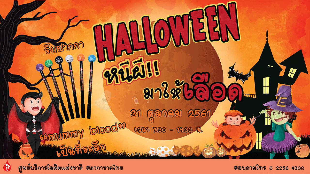 ศูนย์บริการโลหิตแห่งชาติ สภากาชาดไทย ชวนคนสุขภาพดีแต่งแฟนซีแบบผีๆ บริจาคโลหิตในโครงการ “ฮาโลวีน หนีผีมาให้เลือด” ในวันพุธที่ 31 ตุลาคม 2561 เวลา 07.30-19.30 น. ณ ศูนย์บริการโลหิตแห่งชาติ ถนนอังรีดูนังต์ ผู้บริจาคโลหิตจะได้รับปากกา “mummy blood” เป็นที่ระลึก