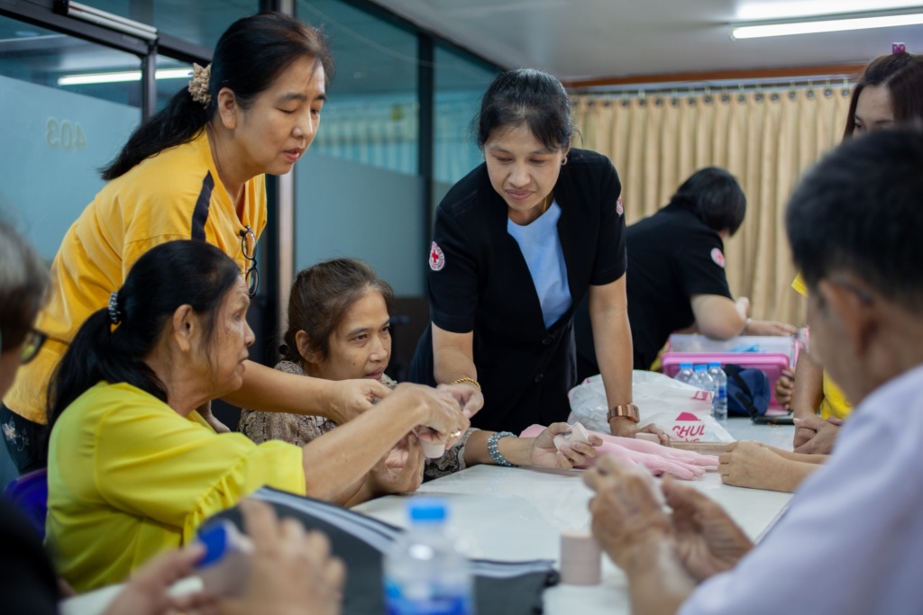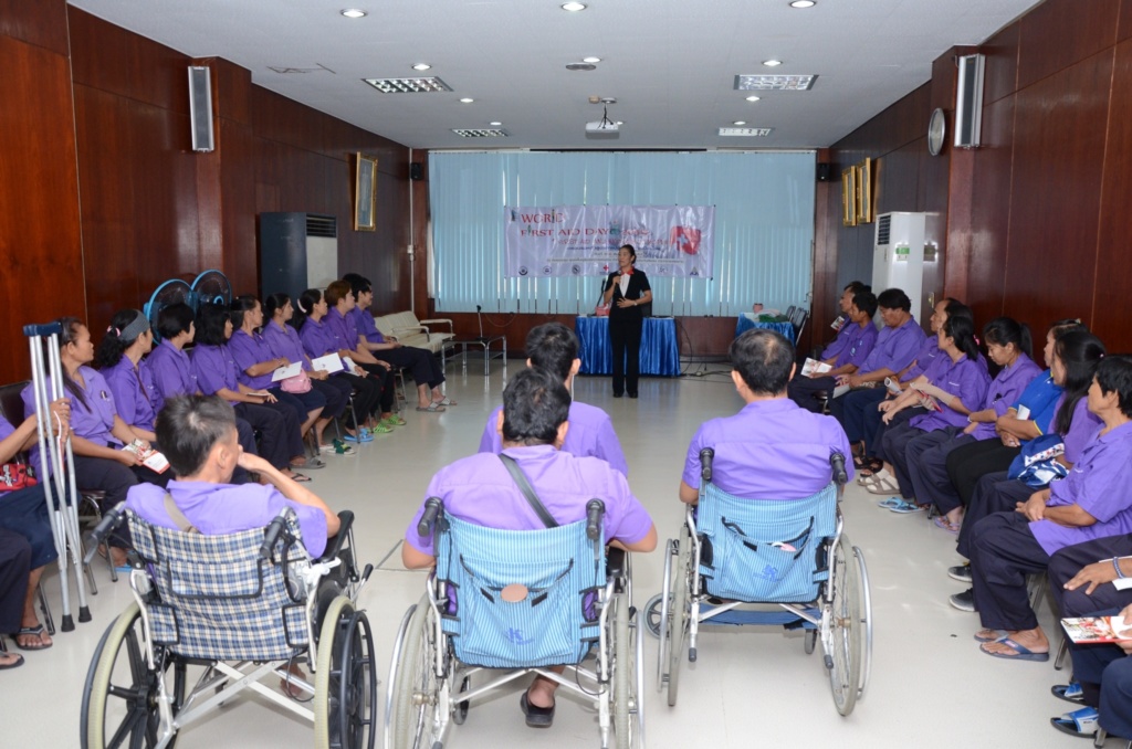 ศูนย์ฝึกอบรมปฐมพยาบาลและสุขภาพอนามัย สภากาชาดไทย จัดอบรมปฐมพยาบาลให้กับผู้พิการทางการเคลื่อนไหว ผู้พิการทางสายตา อาสาสมัครและครูที่ทำงานเกี่ยวกับผู้พิการ เนื่องในวันปฐมพยาบาลโลก ประจำปี 2562 ภายใต้แนวคิด “First aid and excluded people : Addressing Exclusion through first aid” โดยบูรณาการร่วมกับหน่วยงานที่เกี่ยวข้อง ได้แก่ ศูนย์ฟื้นฟูสมรรถภาพคนงาน ภาค 1 (จ.ปทุมธานี) สำนักงานประกันสังคม กระทรวงแรงงาน สหกรณ์บริการคนตาบอดแห่งประเทศไทย และมูลนิธิช่วยคนตาบอดแห่งประเทศไทย เพื่อเป็นการรณรงค์และส่งเสริมให้กลุ่มบุคคลดังกล่าวได้รับโอกาสในการเรียนรู้เรื่องการปฐมพยาบาลทั้งภาคทฤษฎีและการฝึกปฏิบัติจริง อาทิ หลักการปฐมพยาบาล การจัดท่านอนที่ปลอดภัย การช่วยชีวิตขั้นพื้นฐาน (CPR) การสำลัก และการเข้าเฝือกชั่วคราว สามารถปฐมพยาบาลตนเองได้อย่างถูกวิธีและมีคุณภาพชีวิตที่ดีขึ้น