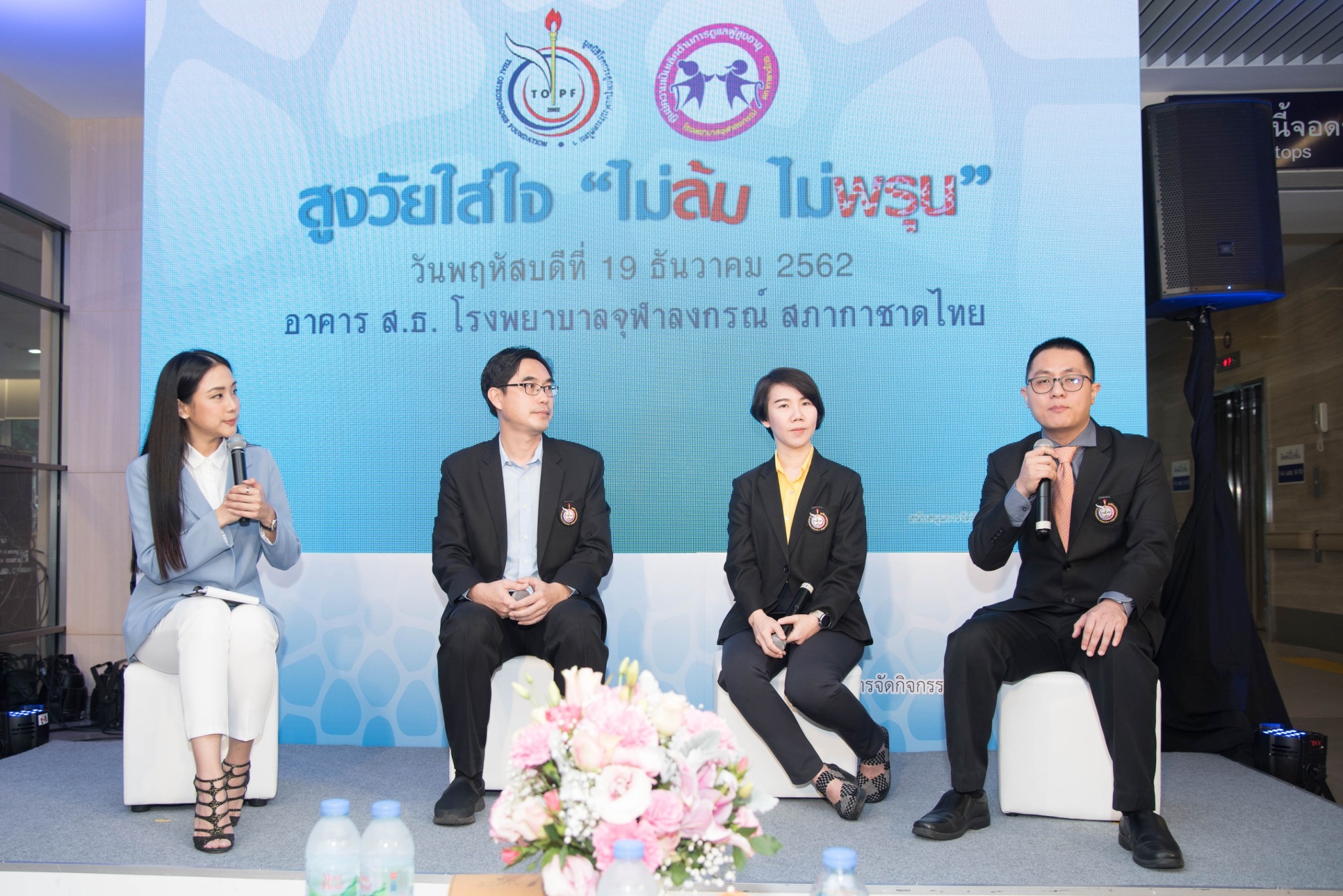 วันที่ 19 ธันวาคม 2562 เวลา 08.15 น. ศูนย์ความเป็นเลิศด้านการดูแลผู้สูงอายุ โรงพยาบาลจุฬาลงกรณ์ สภากาชาดไทย ร่วมกับมูลนิธิโรคกระดูกพรุนแห่งประเทศไทย ในพระอุปถัมภ์ของสมเด็จพระเจ้าพี่นางเธอเจ้าฟ้ากัลยาณิวัฒนา กรมหลวงนราธิวาสราชนครินทร์ และบริษัท แอมเจน (ประเทศไทย) จำกัด จัดงาน “สูงวัยใส่ใจ ไม่ล้ม ไม่พรุน” โดยแพทย์ผู้เชี่ยวชาญ และกิจกรรมประเมินความเสี่ยงต่อการหกล้ม และโรคกระดูกพรุน เพื่อส่งเสริมความรู้และความเข้าใจเกี่ยวกับการป้องกันการหกล้ม และโรคกระดุกพรุนซึ่งเป็นภาวะที่พบได้บ่อยในผู้สูงอายุ ณ ตึก ส.ธ. โรงพยาบาลจุฬาลงกรณ์ สภากาชาดไทย