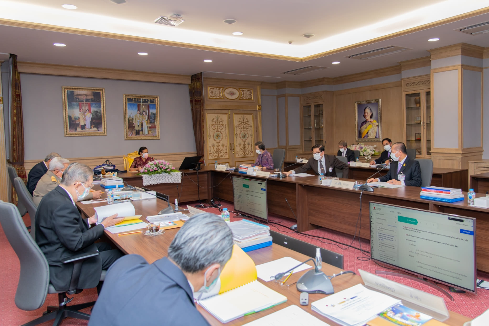 ต่อมา เสด็จขึ้นชั้น 9 และเสด็จเข้าห้องประชุมใหญ่ ทรงเป็นประธานการประชุมคณะกรรมการสภากาชาดไทย ครั้งที่ 343 เพื่อติดตามผลการดำเนินงานภารกิจต่าง ๆ ของสภากาชาดไทย โดยมีระเบียบวาระการประชุม อาทิ รายงานความก้าวหน้าการพัฒนาระบบเทคโนโลยีสารสนเทศของสภากาชาดไทย รายงานการดำเนินงานของคณะกรรมการบริหารความเสี่ยงของสภากาชาดไทย รายงานการดำเนินงานของคณะกรรมการอำนวยการกลุ่มบริการทางการแพทย์ สภากาชาดไทย รายงานการดำเนินงานของคณะกรรมการอำนวยการกลุ่มบริการโลหิต อวัยวะ และผลิตภัณฑ์ชีววัตถุ รายงานการดำเนินการของคณะกรรมการทรัพยากรบุคคลของสภากาชาดไทย โครงการยุทธศาสตร์และการย้ายโรงงานผลิตชีววัตถุและยาปราศจากเชื้อของสถานเสาวภา สรุปรายงานการถวายผ้าพระกฐินสภากาชาดไทย ประจำปี 2564 รายงานการดำเนินงาน การจัดหา จัดสรร จัดบริการ วัคซีนป้องกันโรคโควิด-19 และระเบียบวาระอื่น ๆ