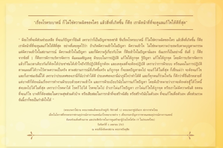 พระราชทานพระราโชบายเพื่อเป็นแนวทางในการรับมือกับสถานการณ์การแพร่ระบาดของโรคติดเชื้อไวรัสโคโรนา 2019 อ่านต่อ
