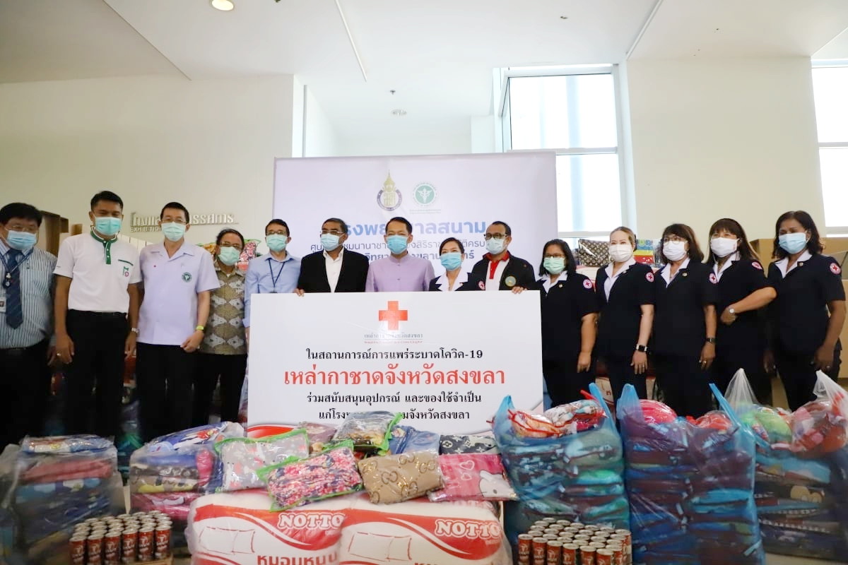วันที่ 21 เมษายน 2564 นางกัญจนา เกลี้ยงเกลา นายกเหล่ากาชาดจังหวัดสงขลา พร้อมด้วย นายจารุวัฒน์ เกลี้ยงเกลา ผู้ว่าราชการจังหวัดสงขลา นายวงศกร นุ่นชูคันธ์ รองผู้ว่าราชการจังหวัดสงขลา นางพวงศรี นุ่นชูคันธ์ รองนายกเหล่ากาชาดจังหวัดสงขลา นายจรัญ จันทรปาน ปลัดจังหวัดสงขลา และ กรรมการ/สมาชิกเหล่ากาชาดจังหวัดสงขลา ส่งมอบชุดเครื่องนอน ประกอบด้วย หมอน ผ้าห่ม ผ้าปูที่นอนพร้อมปลอกหมอน จำนวน 200 ชุด ให้แก่โรงพยาบาลสนาม เพื่อเตรียมพร้อมในการรองรับผู้ป่วย COVID-19 โดยมี ผู้ช่วยศาสตราจารย์ ดร.นิวัติ แก้วประดับ อธิการบดีมหาวิทยาลัยสงขลานครินทร์ รับมอบ ณ ศูนย์ประชุมนานาชาติฉลองสิริราชสมบัติครบ 60 ปี อำเภอหาดใหญ่ จังหวัดสงขลา